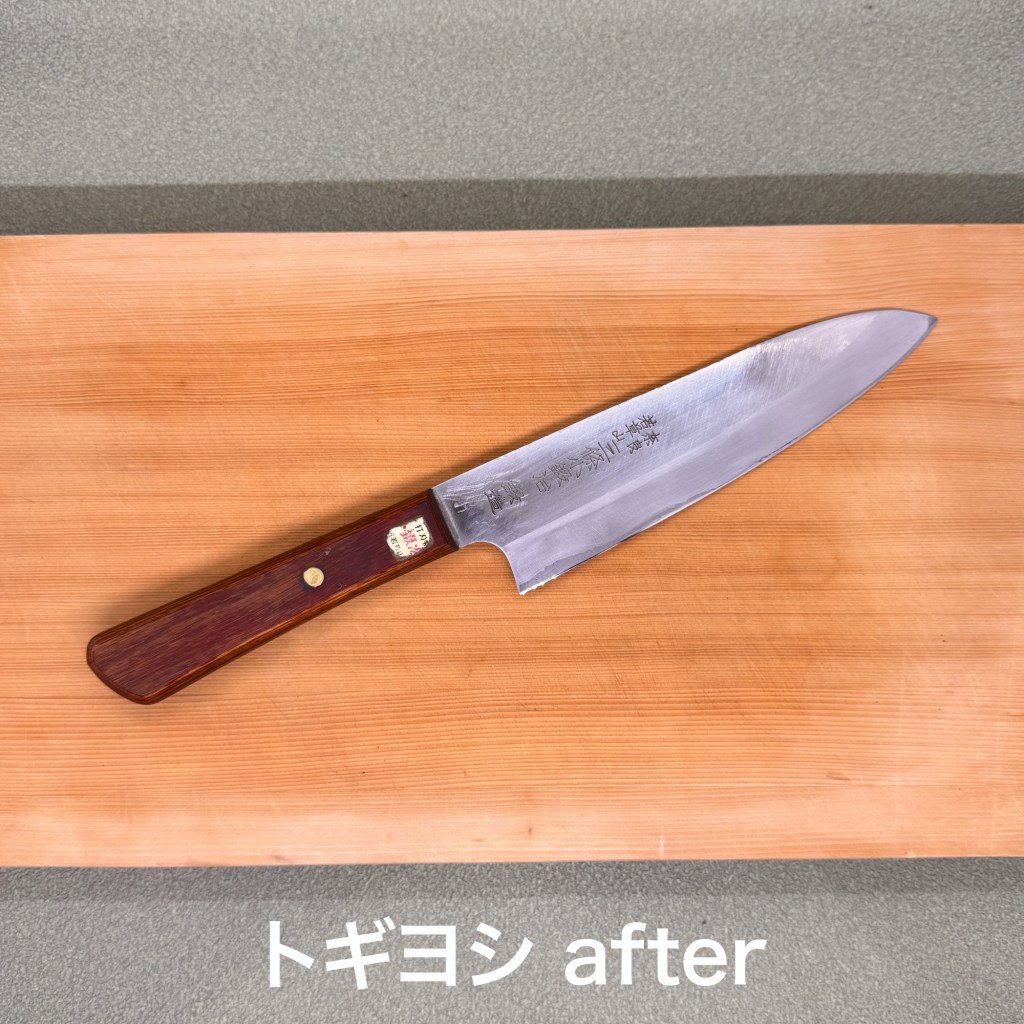 三条小鍛冶の三徳包丁は久しぶりな研ぎのご依頼ありがとうございます。芯金が鋼なので黒ずんでいました。磨いてみると錆が進行していて穴が空いていましたが、刃先には影響は出ませんでした。後部から刃の厚さをみると、十分薄いのですが、指でなぞってみたら中心部より前の方が少し厚くなっているようですので、次回は全体的に薄めたいと思います。