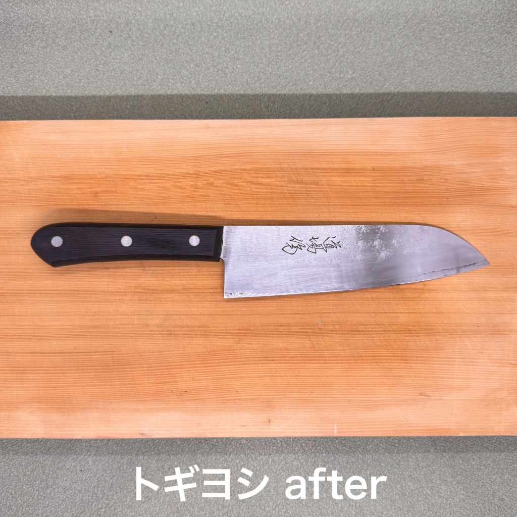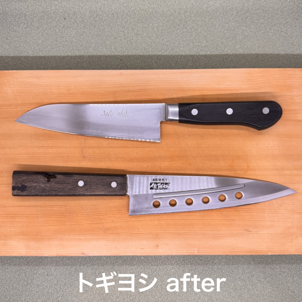 超お得意様の包丁。いつもありがとうございます。宗隆の三徳包丁は修学旅行土産の定番。だいぶ研ぎ進んでいますがまだまだ現役で活躍出来ます。便利くんは切った食材が吸い付かないように穴が空いているのが特徴。何度も研いでいるので私の形になっているのでスムーズに研ぎ上がりました。