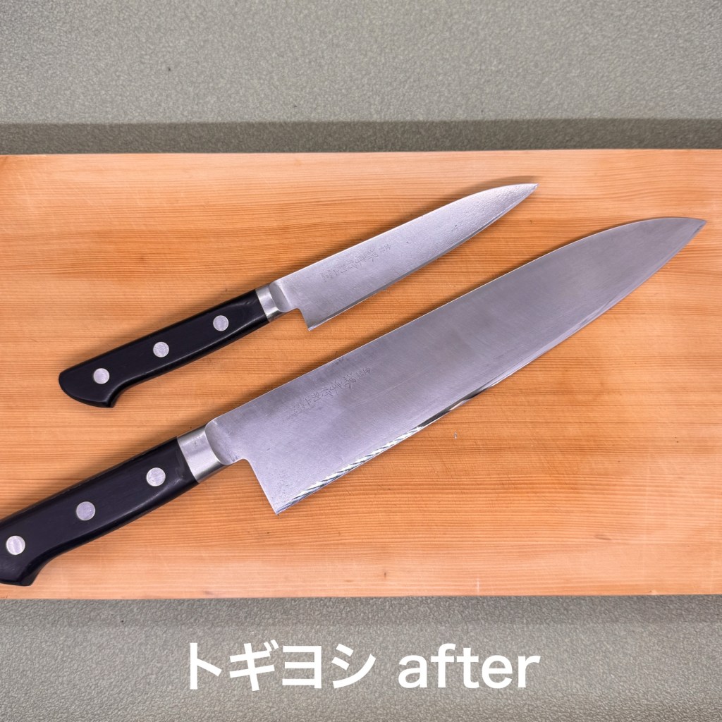 堺孝行のペティと大きな牛刀。細かい錆によるデコボコがあるので鋼製ですね。CNSベベルで磨いて綺麗になってますがデコボコは消えませんでした。刃先は片刃に研がれていましたのでそのまま片刃で仕上げました。やっぱり鋼は切れ味がいいですね!