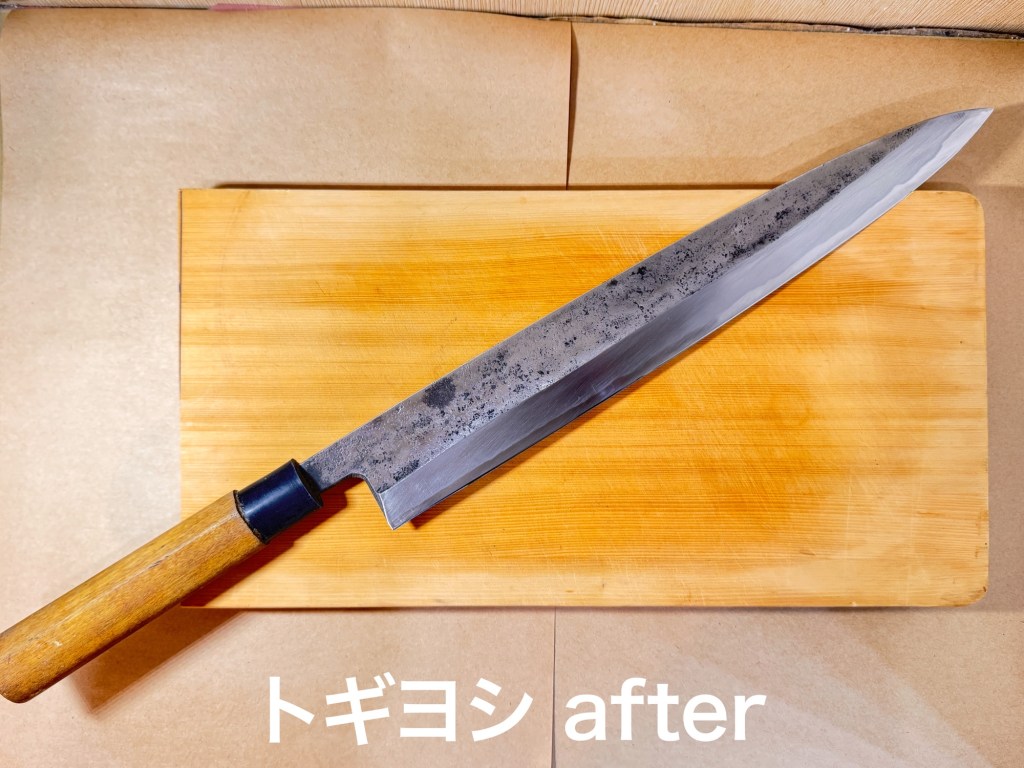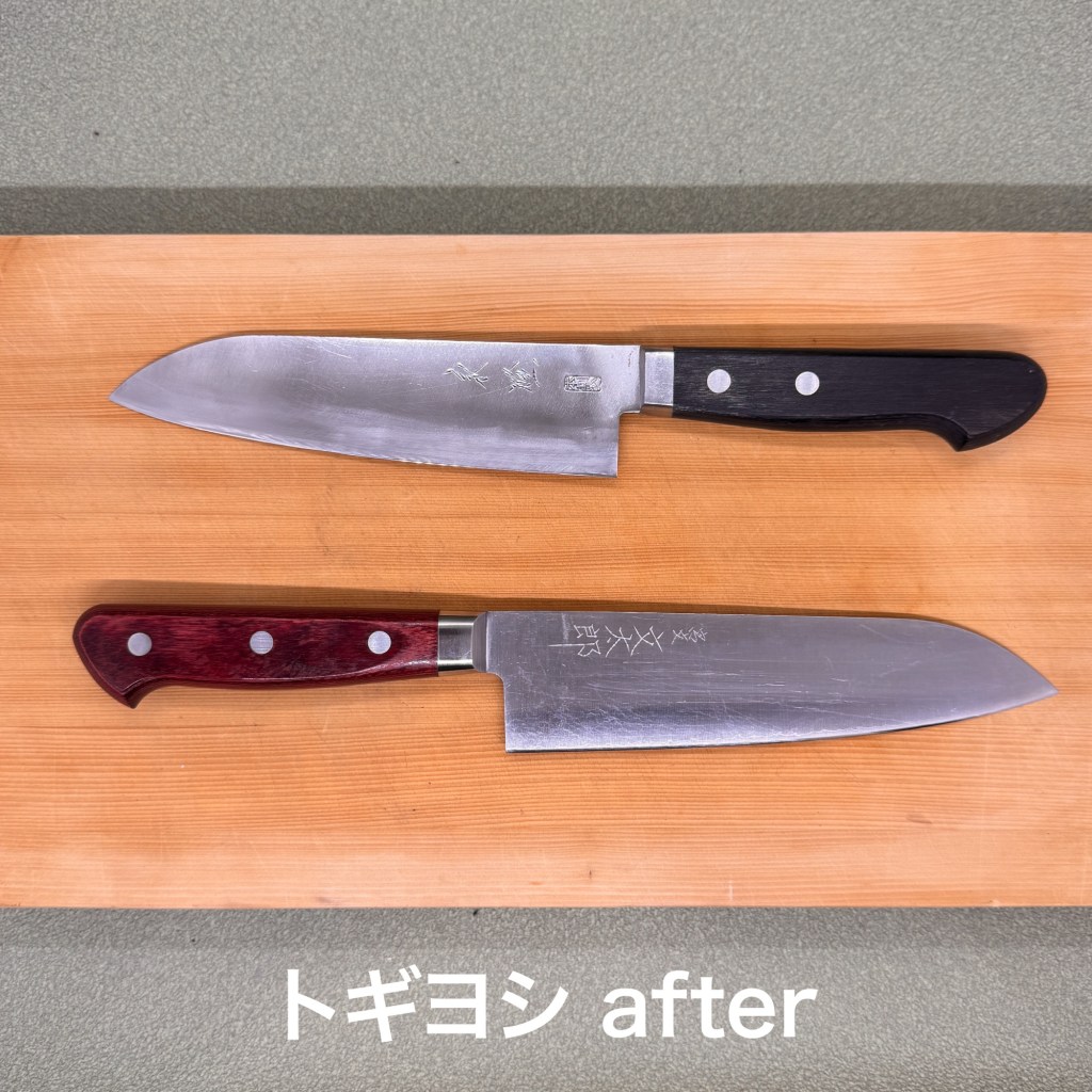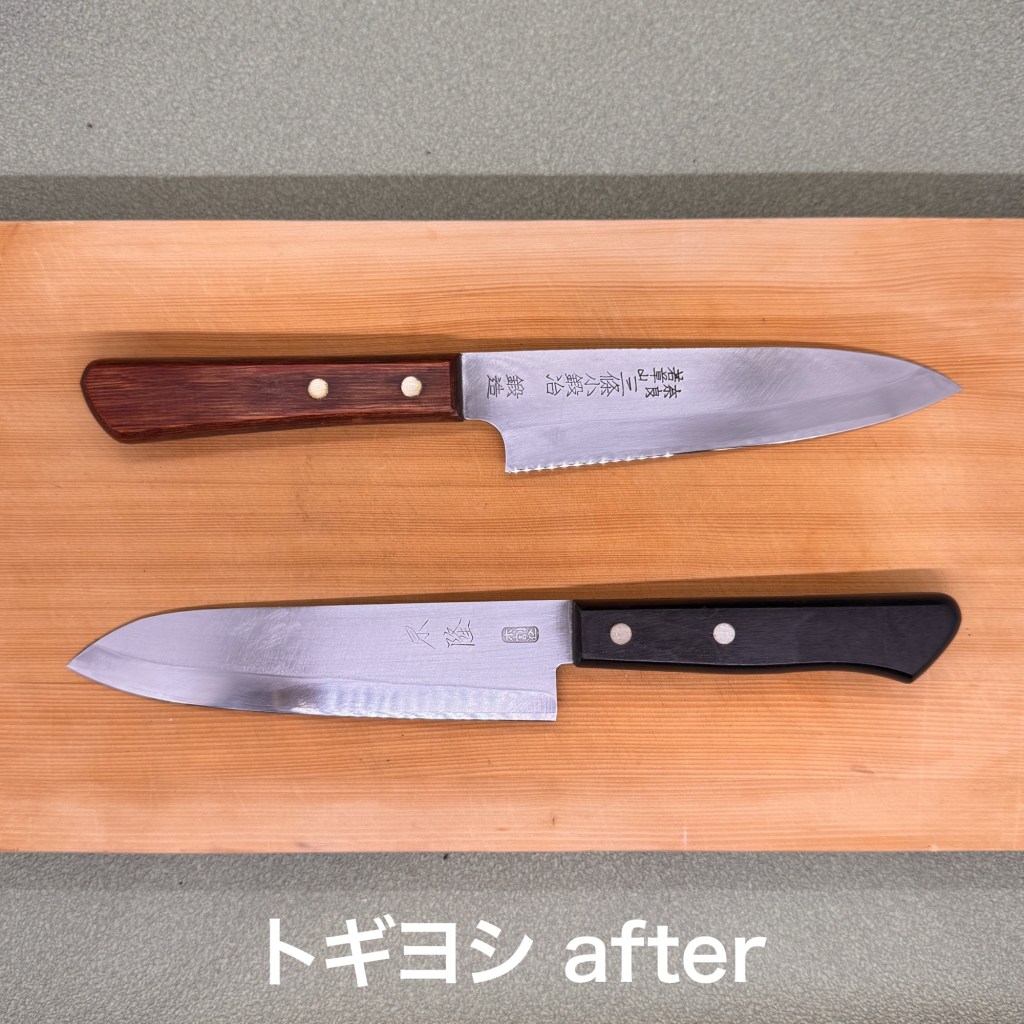 宮文 文太郎の三徳包丁、宗隆の三徳包丁、関孫六の三徳包丁、Galaxyの三徳包丁はスムーズ研ぎ上がりました。三條小鍛冶の牛刀、宗隆の三徳包丁は刃先と手元が下がり全体が緩くカーブしている独特の研ぎ方、これ多くて、しかも切れ味がイマイチだそうです。手元を基準に刃先を整えて仕上げました。大きな身おろし出刃は刃の長さが37センチもあります。切刃がディスクグラインダーで削ったようなデコボコの痕があり、荒砥でフラットに戻して仕上げました。仕上げまで苦労するかと思ったら、とてもスムーズに研ぎ上がりました。