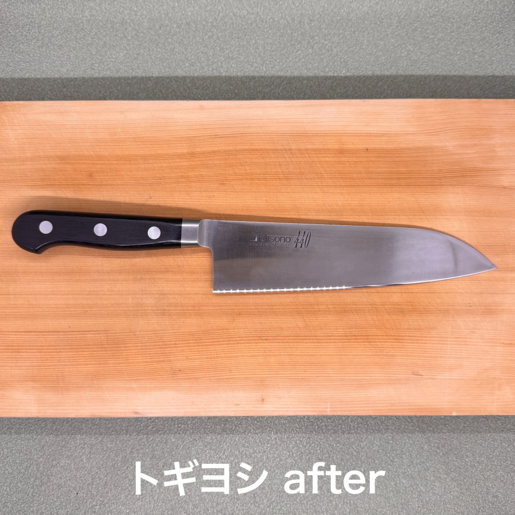 ミソノ440三徳包丁はお得意様の包丁。いつもありがとうございます。刃先の摩耗は前回からの期間を考えると順当なところ。先端の折れを削ってスムーズに仕上がりました。