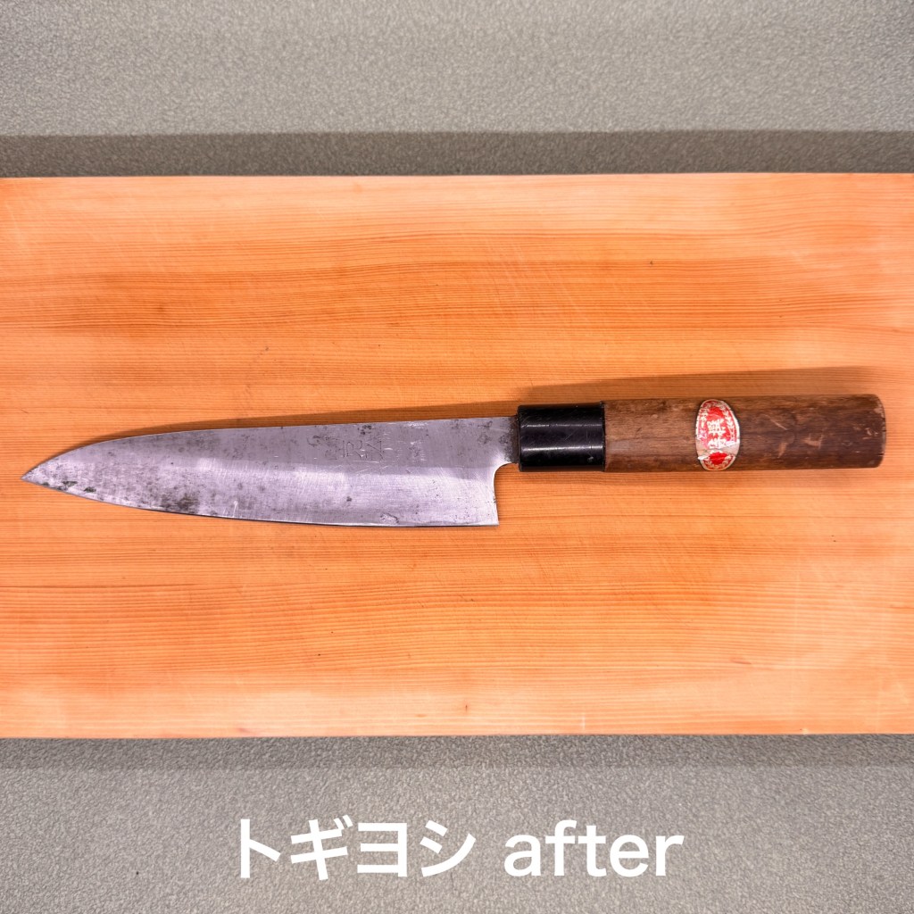 関孫六の出刃包丁は錆びて真っ赤!切先の方は刃先に錆びがありましたが大きな影響は出ないで無事仕上がりました。錆と傷を消すのがちょっと大変でした。