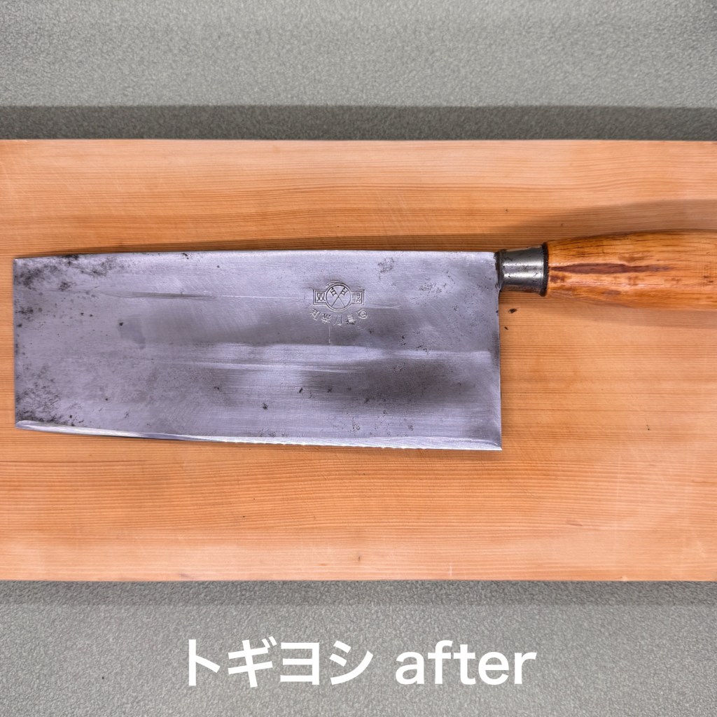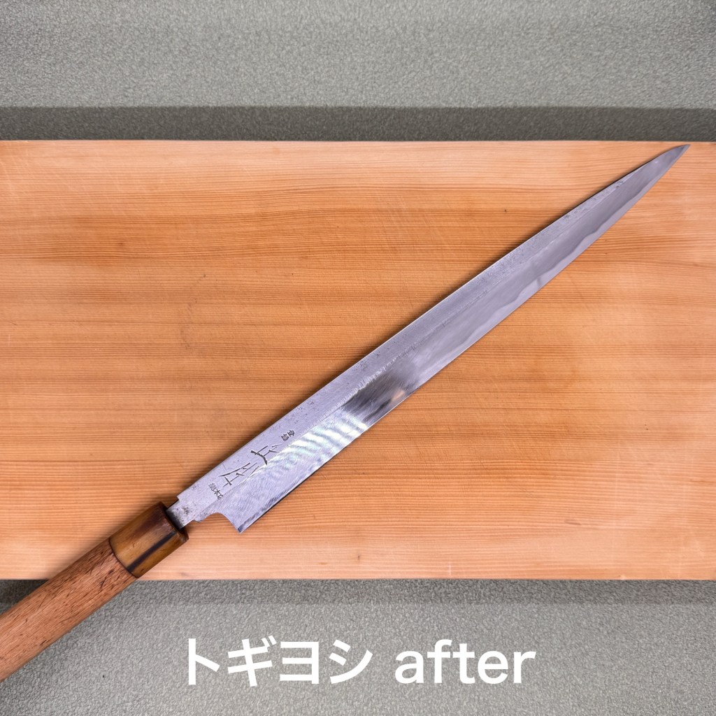 正本の柳刃包丁、かなり使い込まれていて柄には脂が溜まっており、オレンジ系のクリーナーで落とし、刃先は整っていなかったので荒砥で整え、切刃もフラットでは無かったのでフラットに戻してから研ぎ上げました。