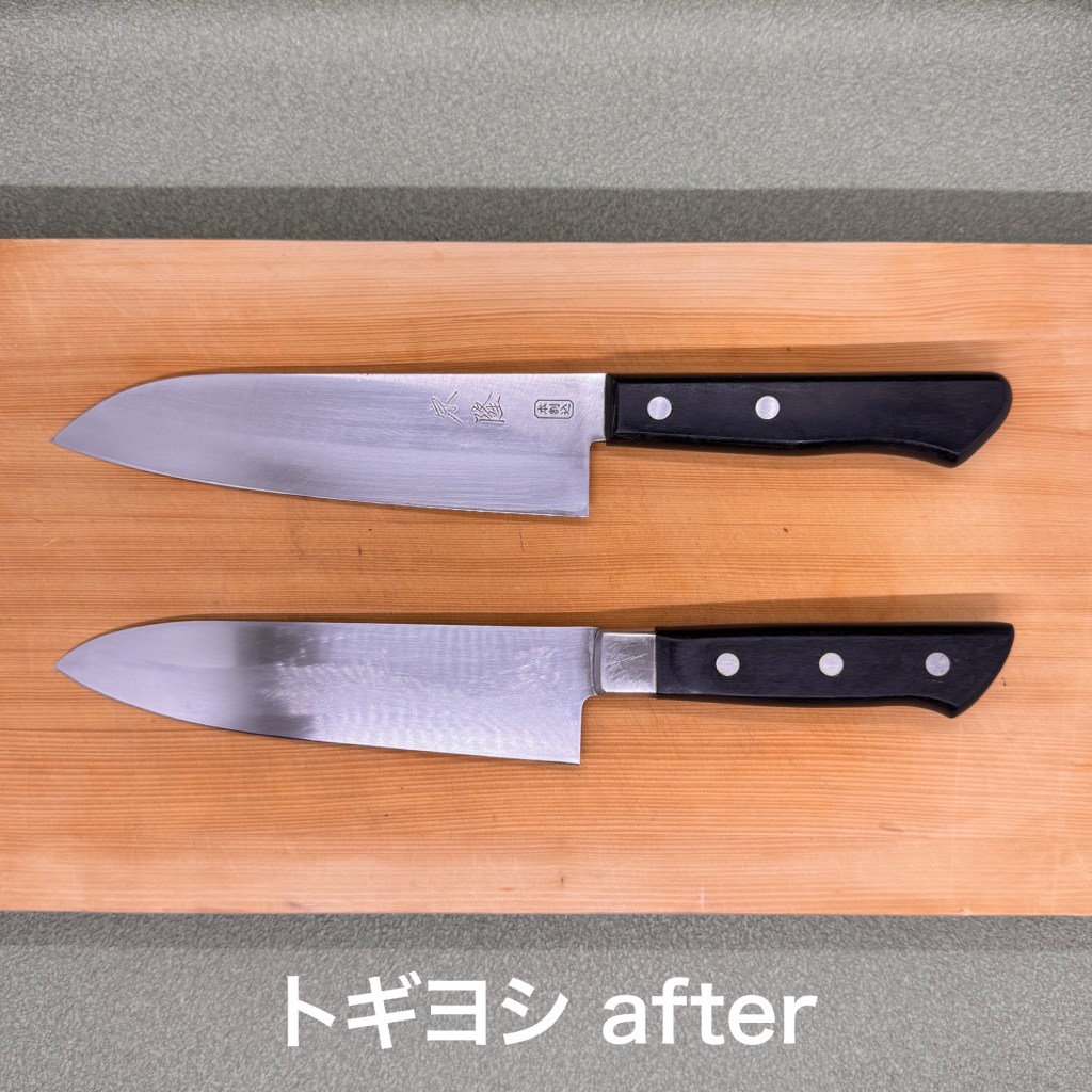 下はKaiの三徳包丁。刃身が厚いので薄めてから仕上げました。食材への入りが良くなったと思います。