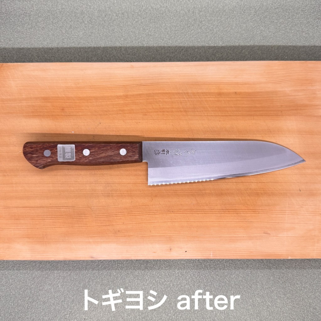 宗隆の三徳包丁は奈良修学旅行の定番土産。刃の途中に波打っている所が1箇所あり、そのまま研ぐと刃線が下がってしまうので金槌でそーっと叩いて直してから研ぎ上げました。鋼部分なので強く叩くと割れるのが怖かった。