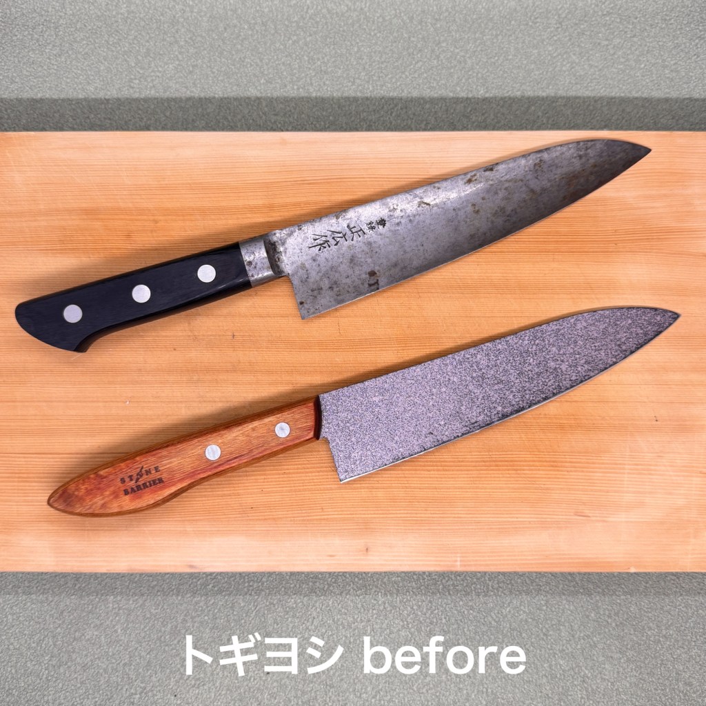正広の牛刀は全鋼の包丁。やっぱり鋼はいいですね。研いでいて気持ちが良いです。もちろん仕上がりもバッチリ👌でも黒ずんで来てその後錆びますので管理が難しい素材です。