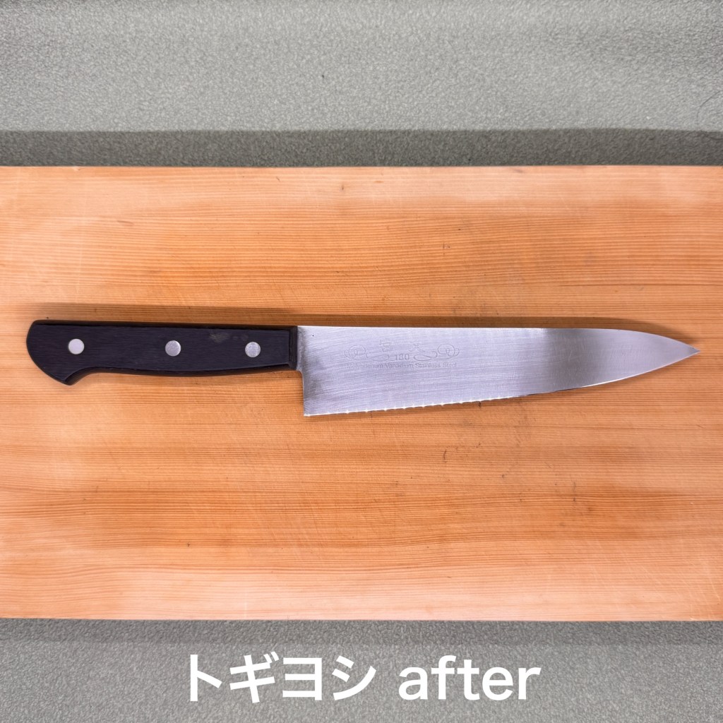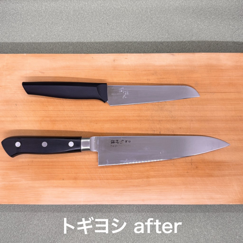関孫六のペティと鋼神技の牛刀。ペティはスムーズに研ぎ上がりましたが牛刀は刃先に錆びがあり、見た目では深く無いかと思ったらしっかり貫通していて刃先を2ミリ位落としてどうにかトギヨシ上がりました。