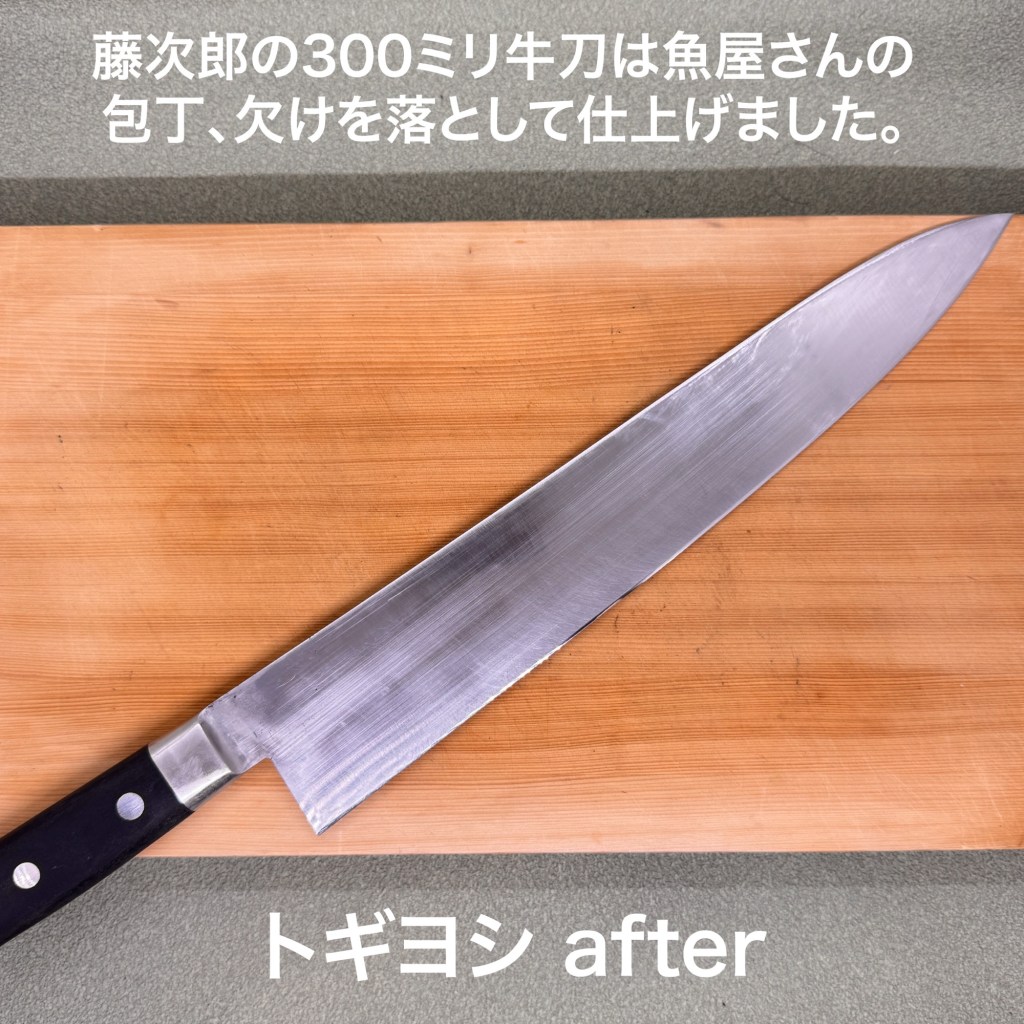 大きな藤次郎の牛刀は魚屋さんの包丁、長さ1センチ、深さ5ミリくらい欠けており、欠けが無くなるまで荒砥で全体を均一に落としてから研ぎ上げました。