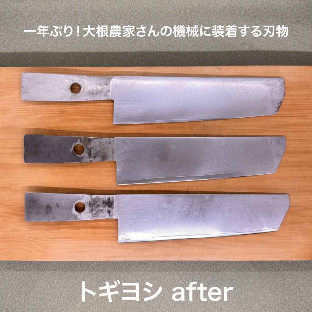柄の無い刃物は大根農家さんの機械に装着する刃物。一年ぶりに研ぎます。今大根出荷のピークになってきました。10月くらいまで続くそうです。釧路産のダイコン食べてね!
