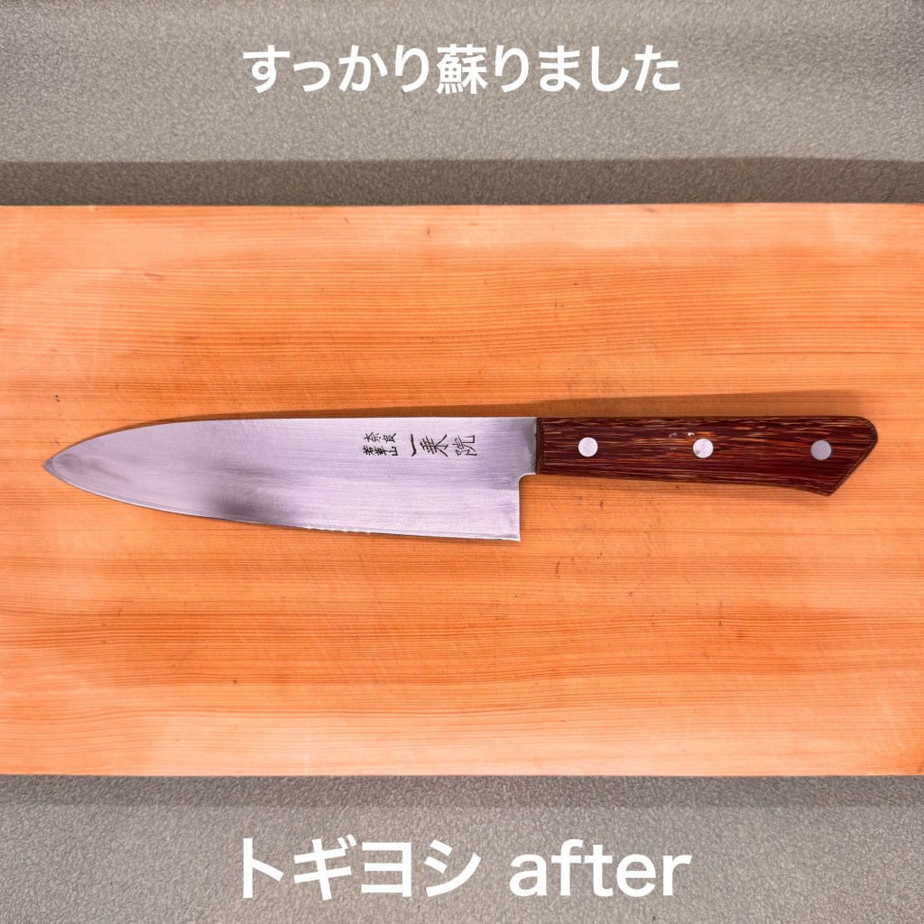 一乗院の牛刀は奈良修学旅行土産の定番包丁。20年は経過しているそうですが劣化は少ない感じ。黒ずみをゴム砥石で磨いたら綺麗な地が出てきて安心。後は通常の研ぎでスムーズに研ぎ上がりました。