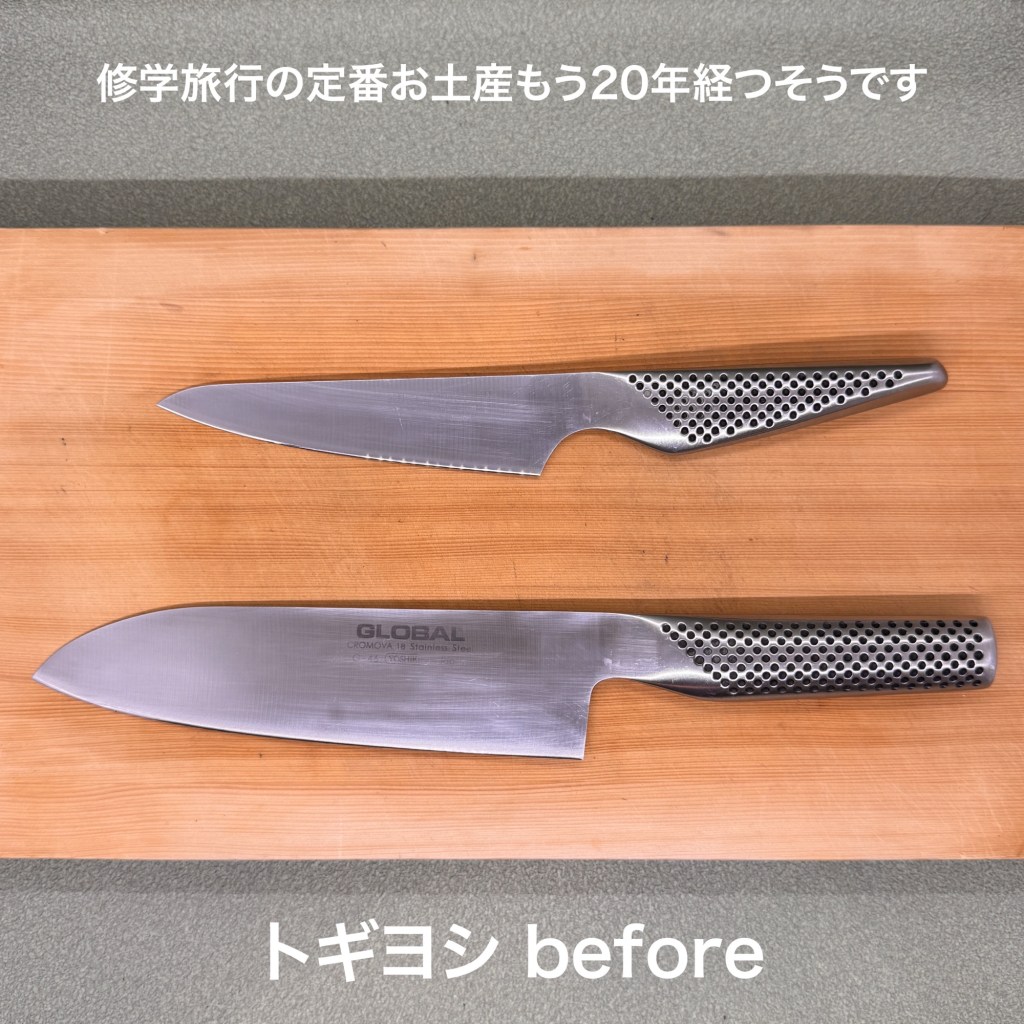 globalのペティと三徳包丁。刃先はかなり欠けていて一度も研いだ事は無いようです。荒砥で欠けを全部落としてから研ぎ上げました。globalは厚めに出来ているので、次回は刃を薄め高い方が良さそうです。