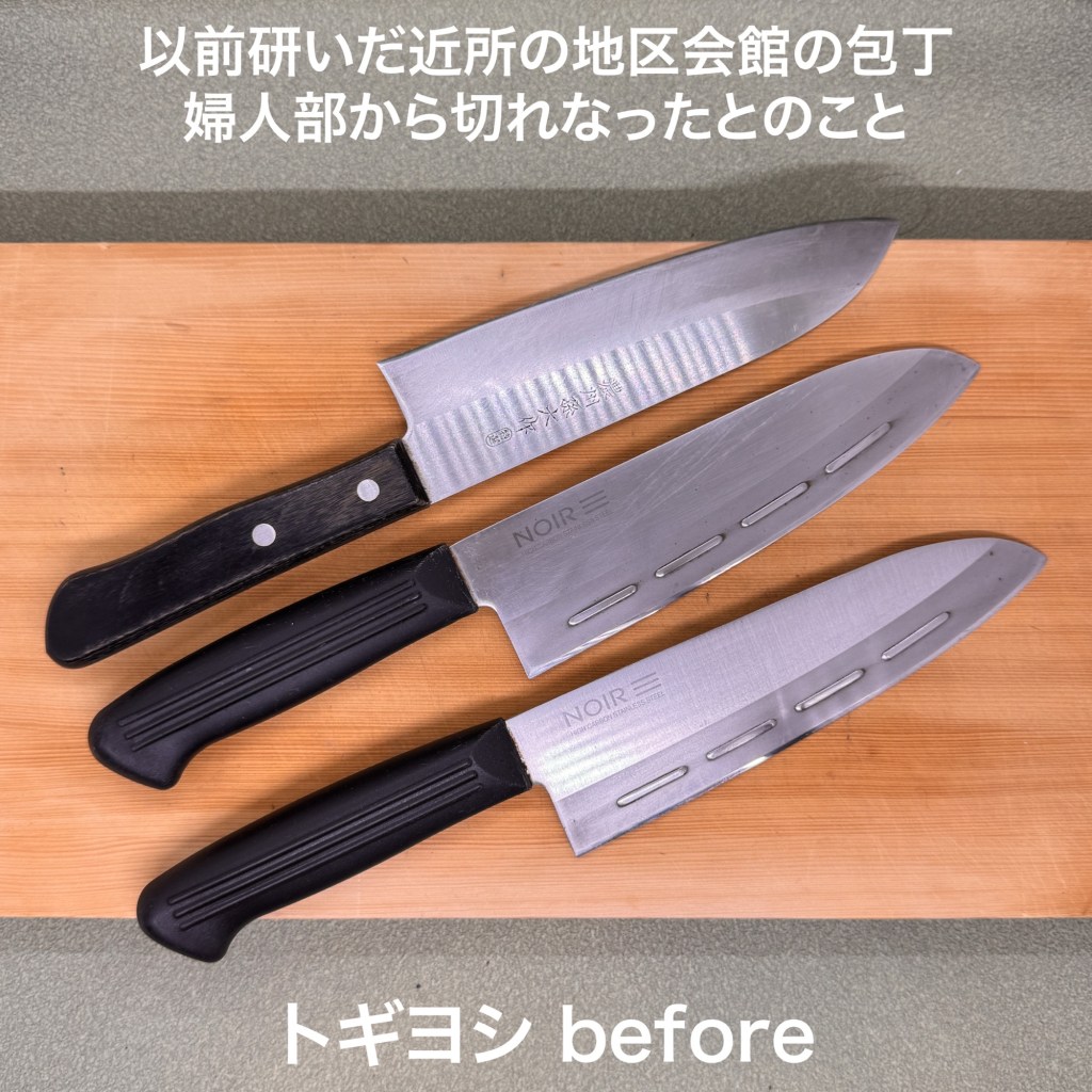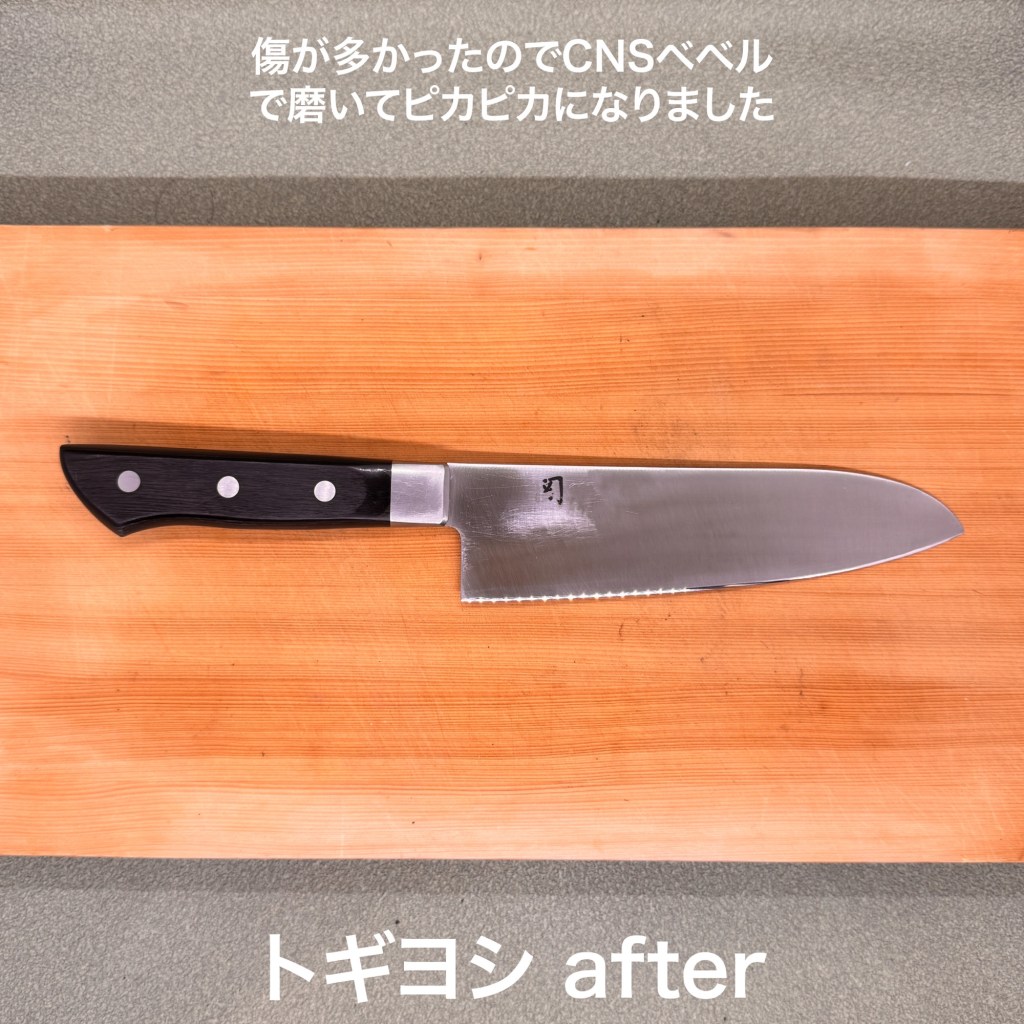 この3本は私の住む地区会館の包丁。1年前に研ぎ、だいぶ使われたようで切れなくなったと婦人部より報告があり持ってきましたとの事。刃先は結構傷んでいましたので荒砥で整えるとともに傷も多かったのでCNSベベルで磨いてからトギヨシ上げました。
