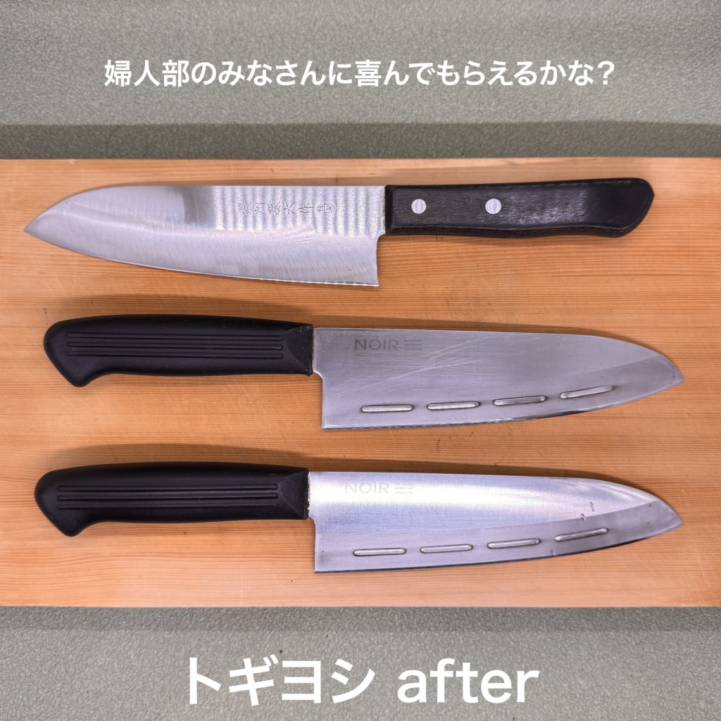 関孫六の三徳包丁は会社のご近所さんの包丁。のぼりを見て寄ってくださいました。小さい欠けがありましたが荒砥で落とし、刃線も整えてから仕上げました。