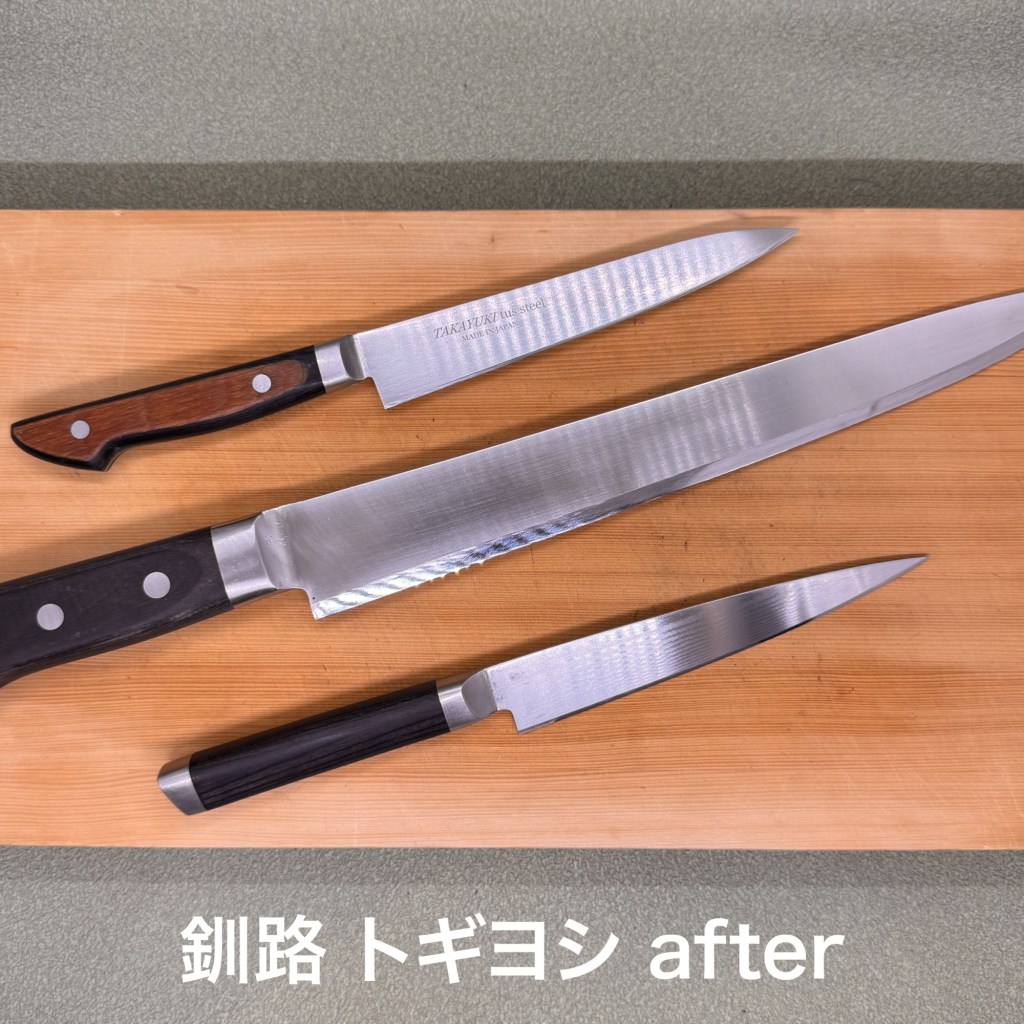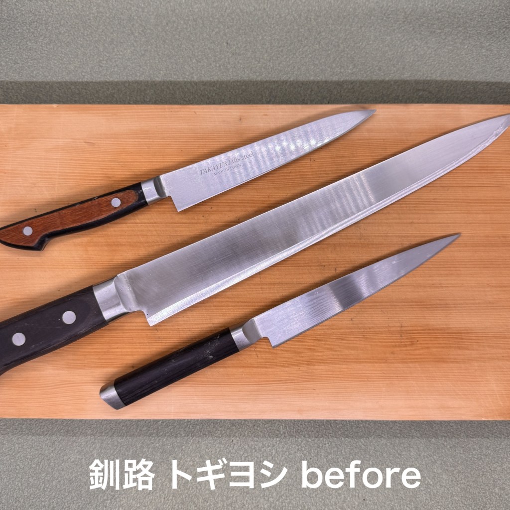 この3本はお得意様の包丁、いつもありがとうございます。大きい包丁は筋引き。片刃なので角度を15度に修正し研ぎ上げました。ペティ2本も片刃になっていましたのでそのまま片刃で研ぎ上げました。グリップに脂汚れが残っていたので筋引きはCNSベベルで磨き、ペティは刃物クリーナーとメラミンスポンジで綺麗に落としました。