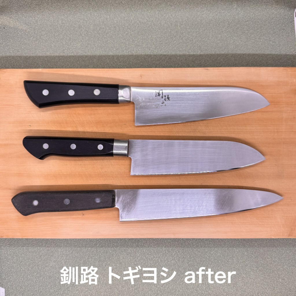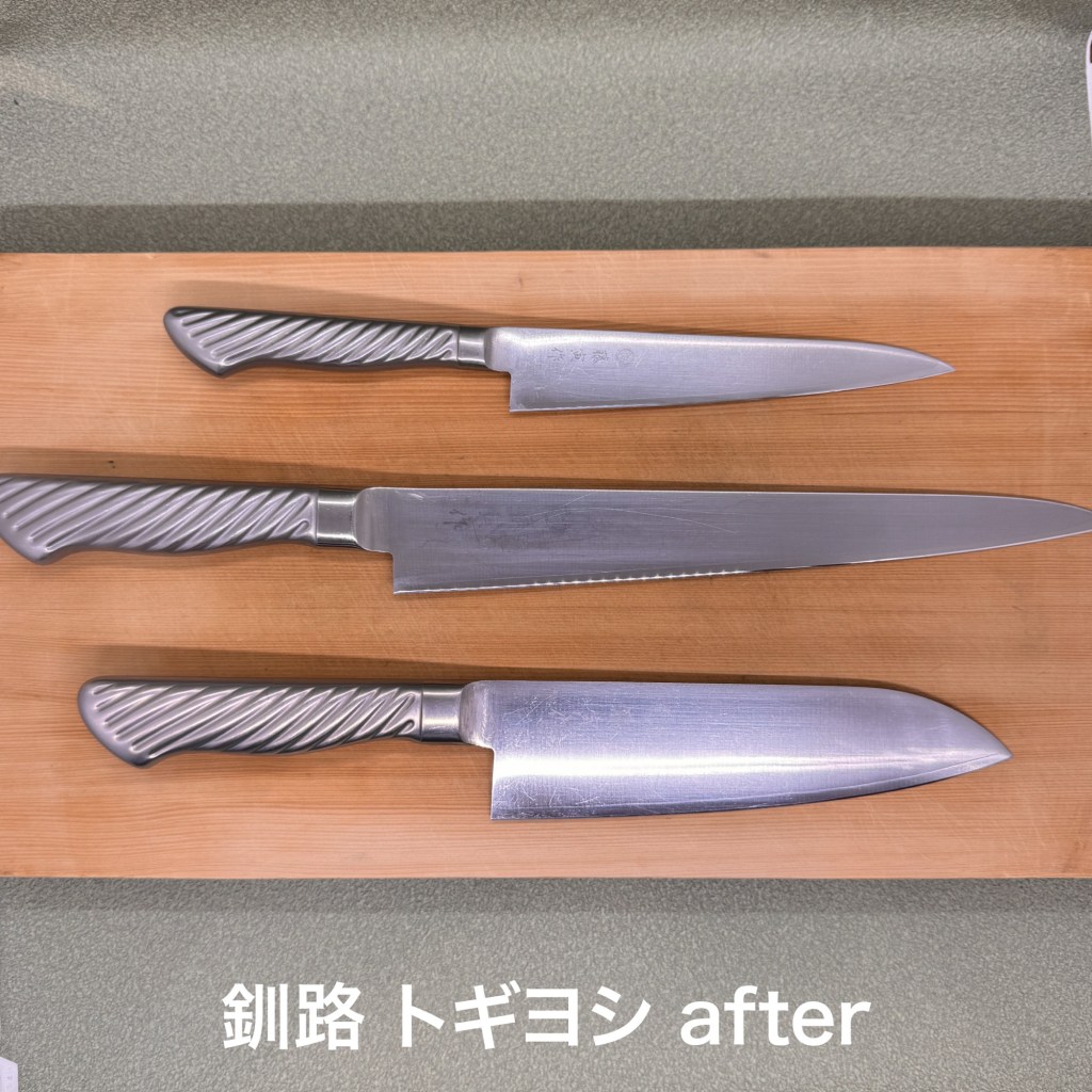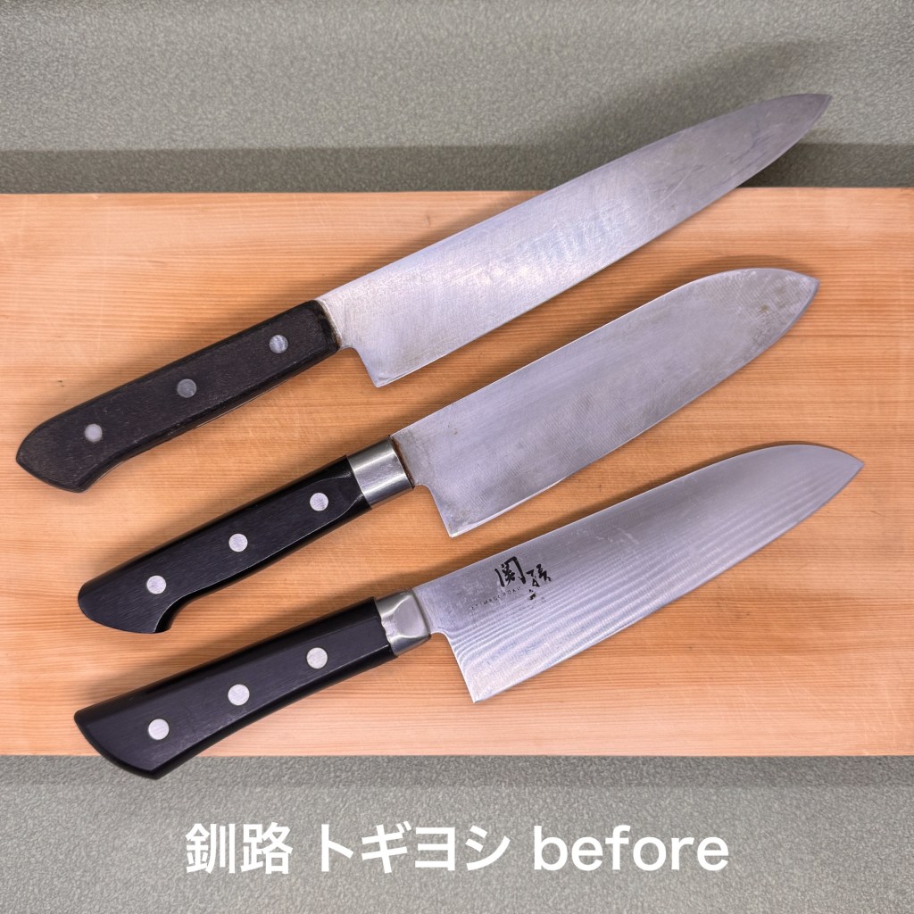 藤寅のペティ、三徳包丁、すじ引き?の3本。ほぼ新品の包丁、一度も研がれていないのでスムーズに仕上がりました。鋼も硬めで研いでいて気持ちよかったです。一緒に牛刀、三徳包丁2本もありがとうございます。ノーブランドの包丁はかなり年数も経過しているのと、研ぎ癖が強かったのですが荒砥で刃線を整えて仕上げました。