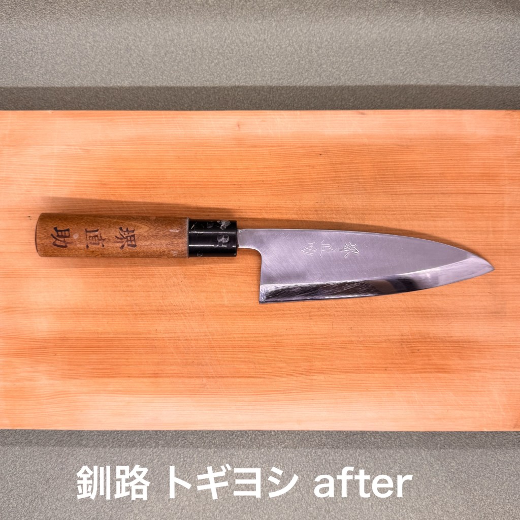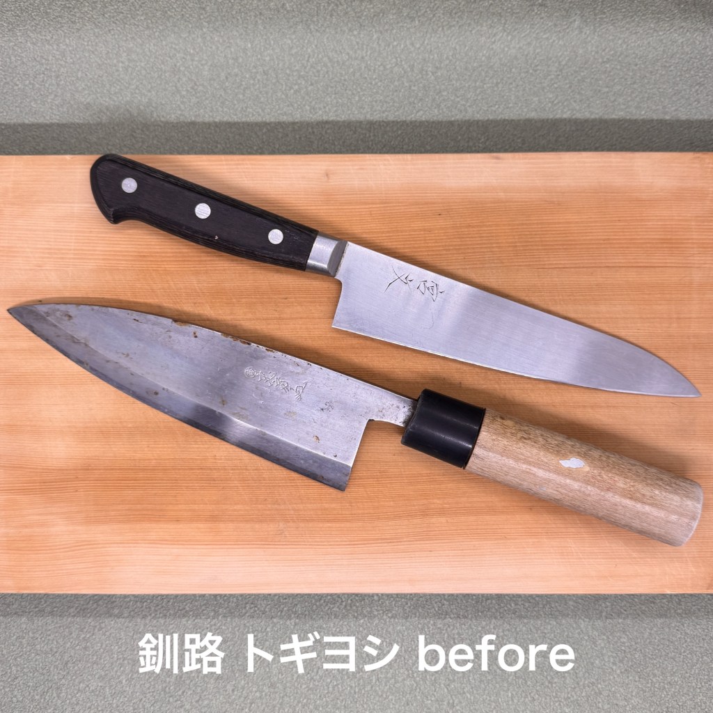 左利きのお得意様の包丁。毎年ありがとうございます。今は貴重な忠房の出刃包丁。いまはカタカナのタダフサになって毛色が変わってきました。芯金が結構硬くて研ぐのが大変でしたが、良い刃に仕上がりました。宮文の牛刀も左利きに研ぎます。いつもと勝手が違うので左利き、左利きと頭のなかで復唱しながら研ぎました。笑笑