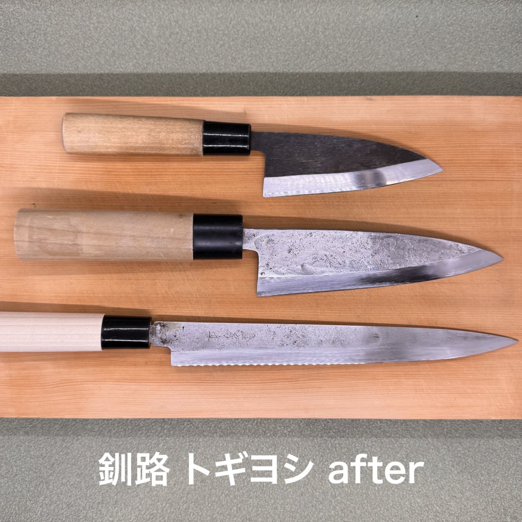 忠近の柳刃、出刃とアジ切りもお得意様の包丁。3本ともだいぶ使い込まれていて、鋼部が錆びていました。刃先には錆穴があるためどこまで仕上げられるか微妙でしたが何とか仕上げる事ができました。柳刃は柄の桂の所が腐食していたので交換、中子は錆はそれほど進行していなかったのは助かりました。