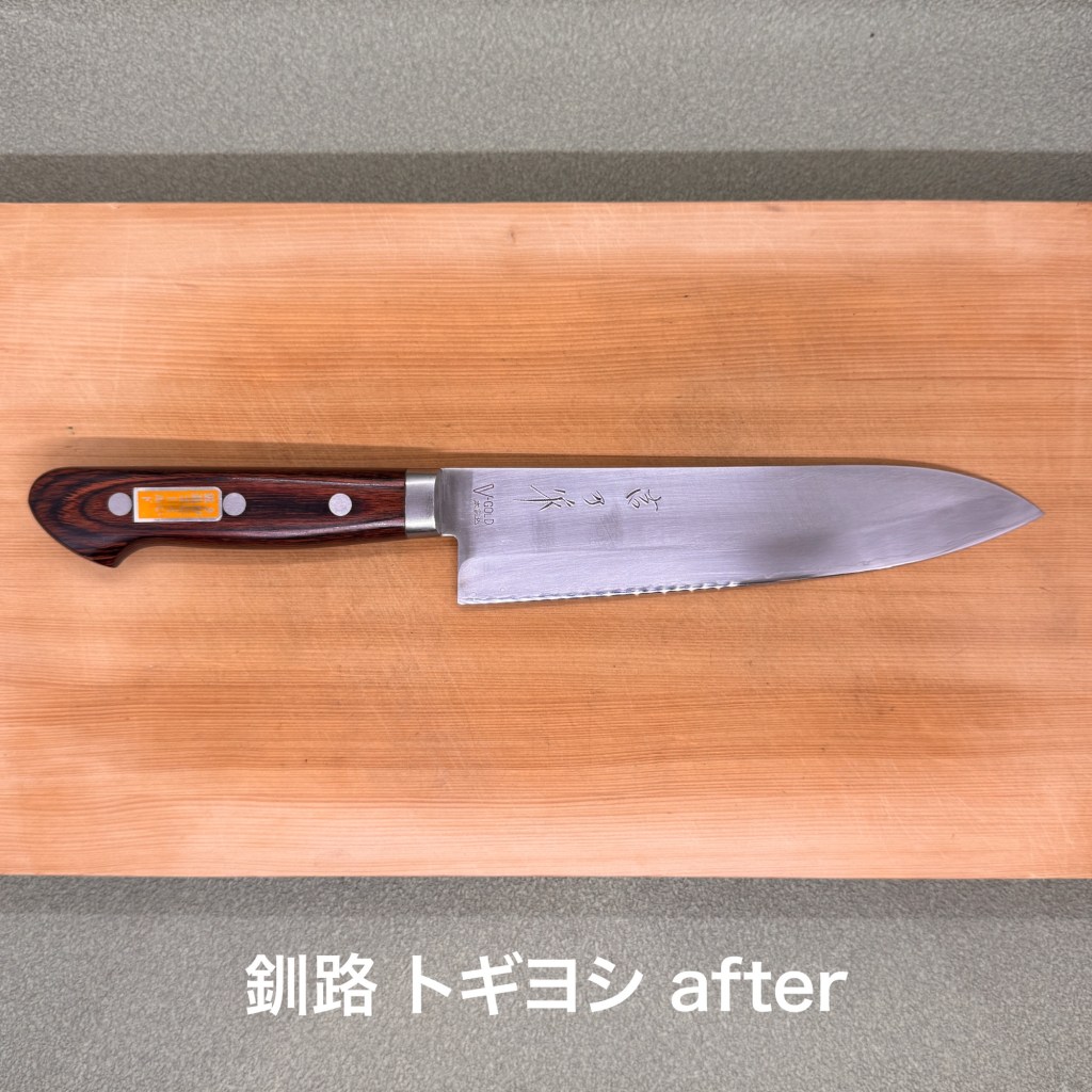 吉乃作の牛刀はお得意様の包丁。傷みは少なかったのでスムーズに研ぎ上がりました。
