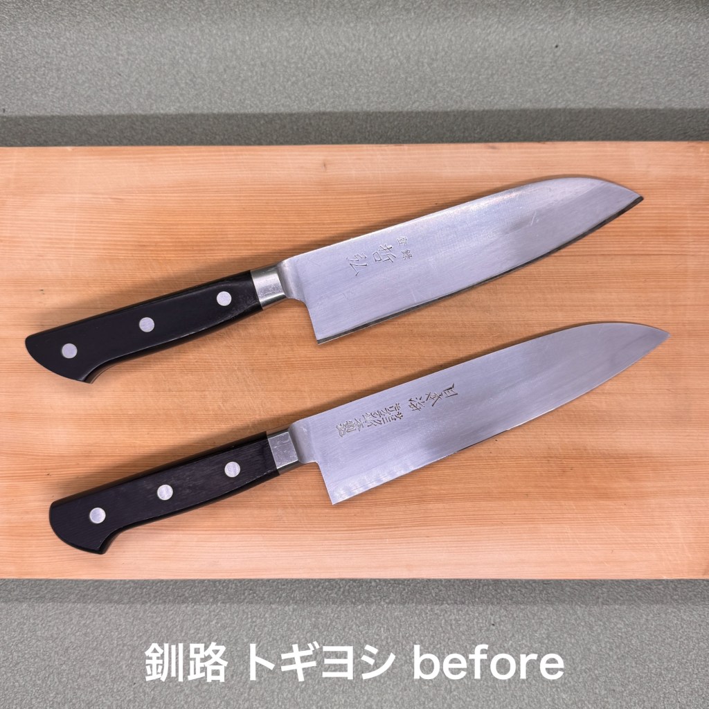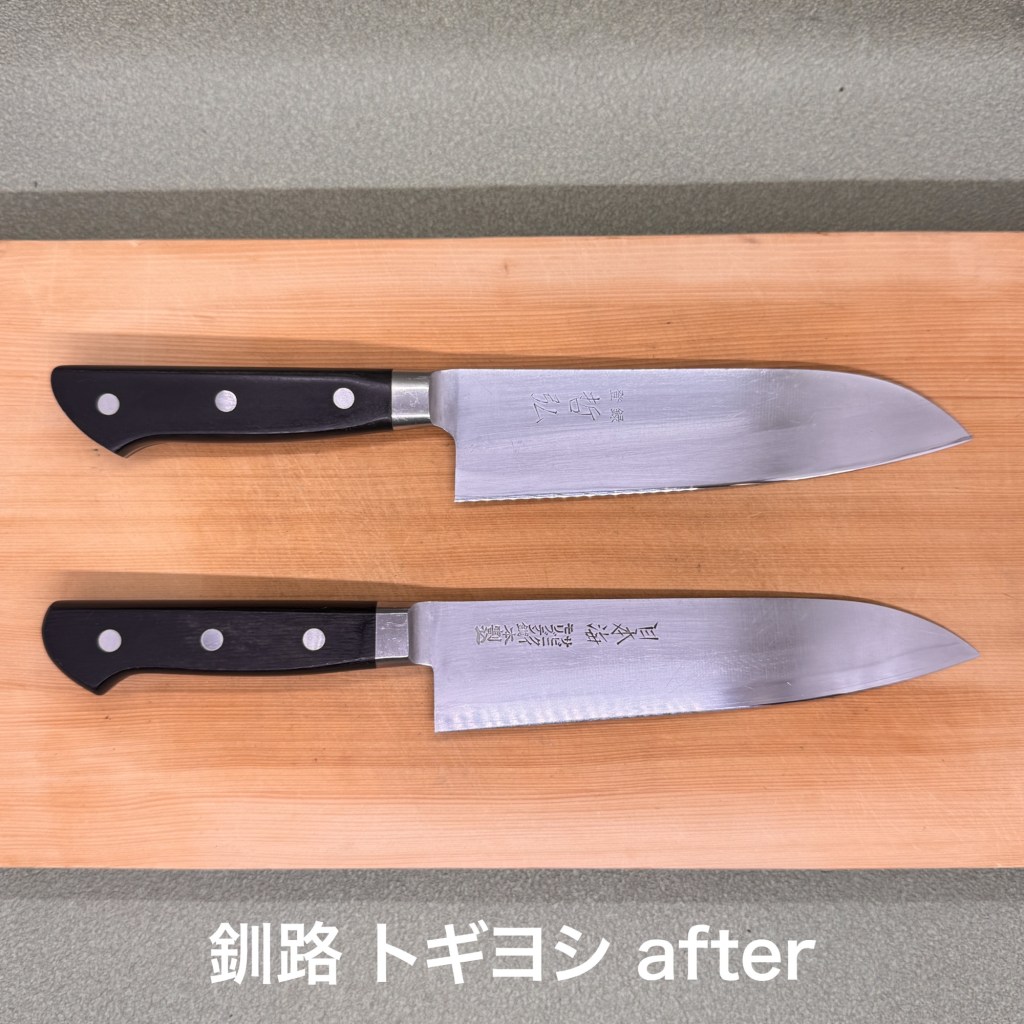 中野特殊刃物工業謹製の哲弘と日本海の三徳包丁はお得意様の包丁。いつもありがとうございます。刃先を見るとだいぶ傷んでいましたので、しっかり荒砥で落として仕上げました。とても綺麗に使われていて、研ぎ師としては嬉しい限りです。