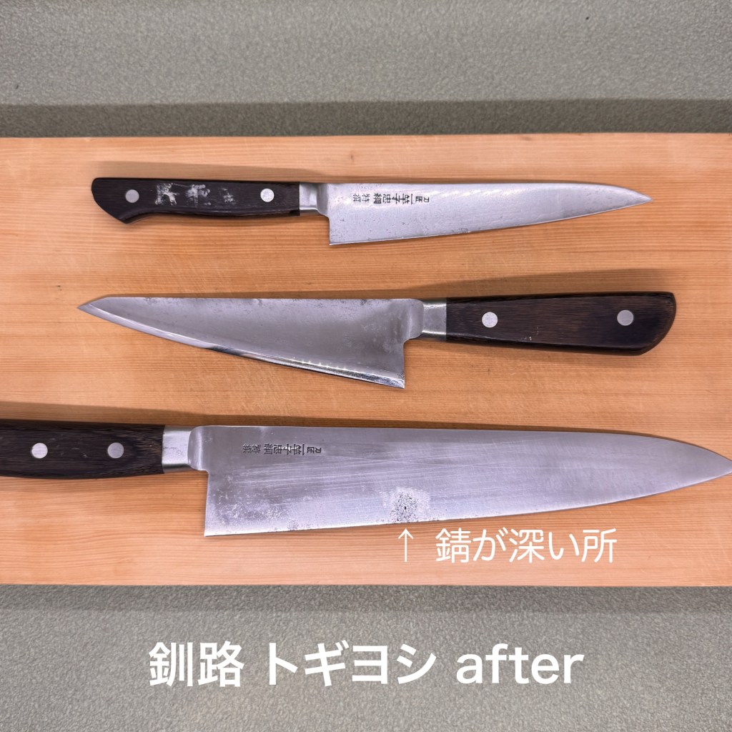 料理師学校で使っていた包丁達、久しぶりに使う事にしたそうです。長年ケースに仕舞われていたので錆が深く入っていました。サビハイダーで処理してからCNSベベルで磨き、左利きで研ぎ上げました。骨スキは出刃の代わりだそうです。
