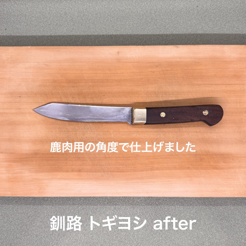 ナイフはハンターさんのナイフ。鹿肉は筋が強いので片側30度で仕上げました。