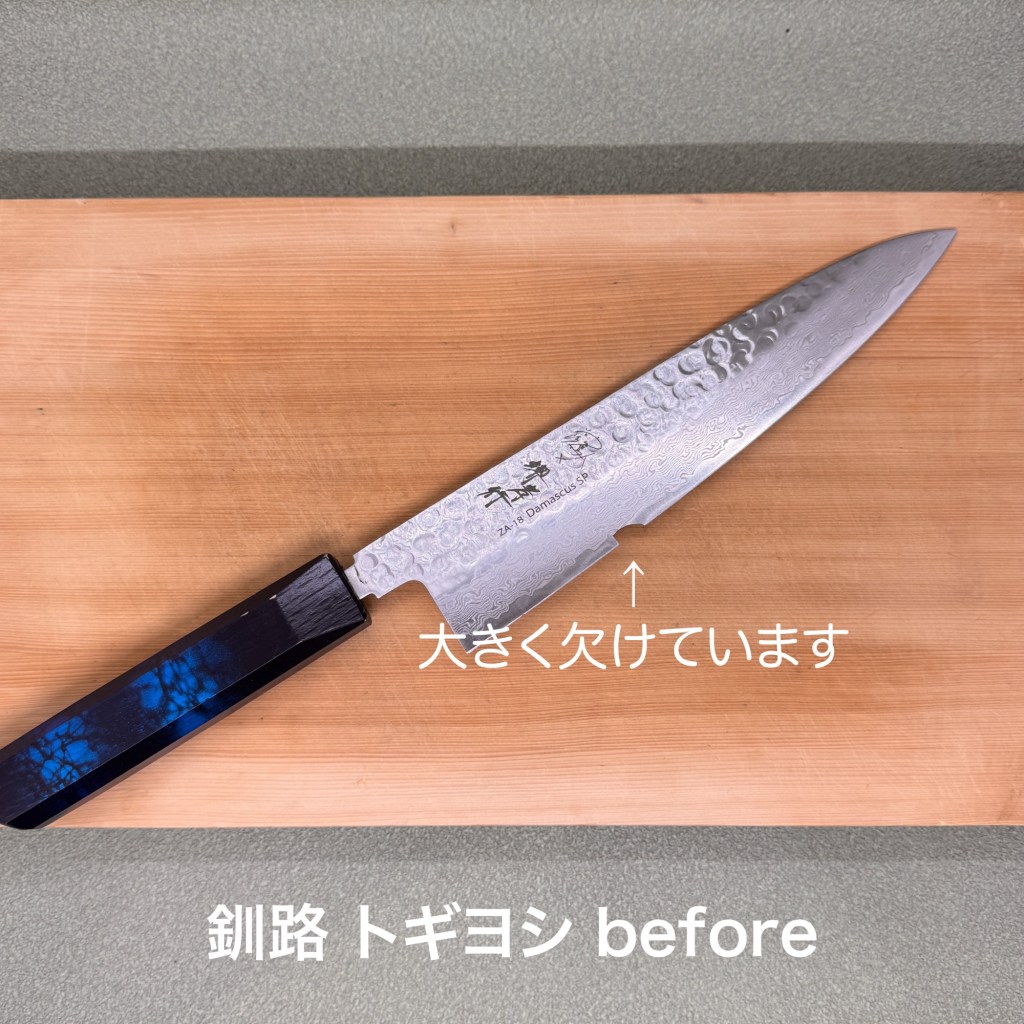堺孝行の牛刀はマグロのカマを切った時に欠けたそうです。出刃包丁を使って欲しかったですね。荒砥でガリガリ落として欠けを無くすのに時間がかかりましたが、その後はスムーズに仕上がりました。