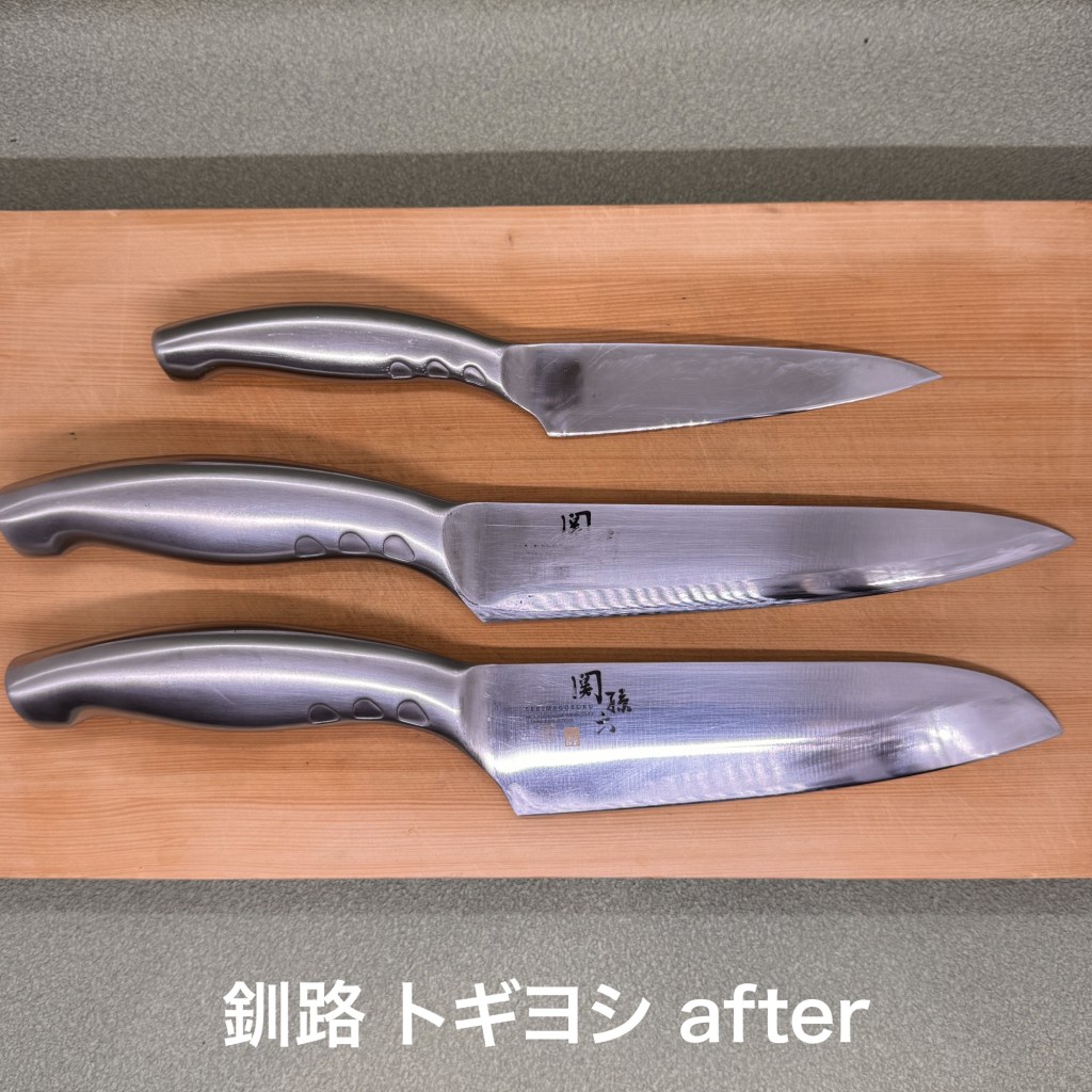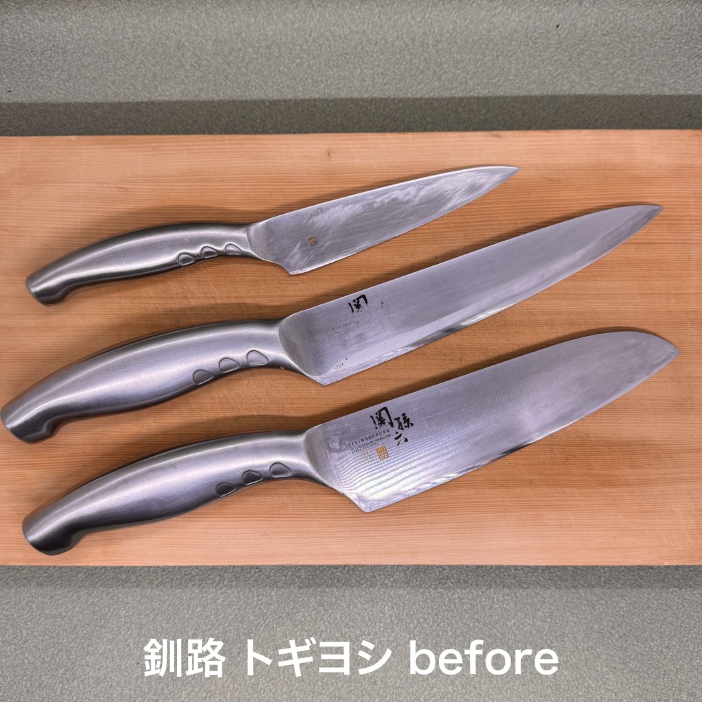 関孫六のペティ、牛刀、三徳包丁。他所で研いでいたそうですが今回はトギヨシにご依頼いただきました。どれも刃先には錆穴が無数にあるのと片刃のように研がれています。荒砥で錆穴を落とし、片刃の様な形状はそのままで研ぎ上げました。