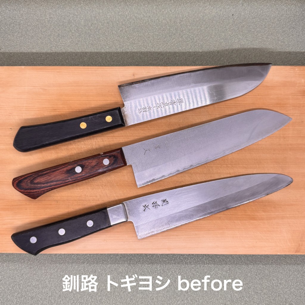 関孫六の牛刀、宮文の三徳包丁、堺清貞の三徳包丁。どれも刃先は穴だらけと言えるほど傷んでいました。荒砥で傷みを消すとともに関孫六の牛刀は刃線を整えてから研ぎ上げました。特に堺清貞はなかなか仕上のレベルが上がらず時間がかかりました。