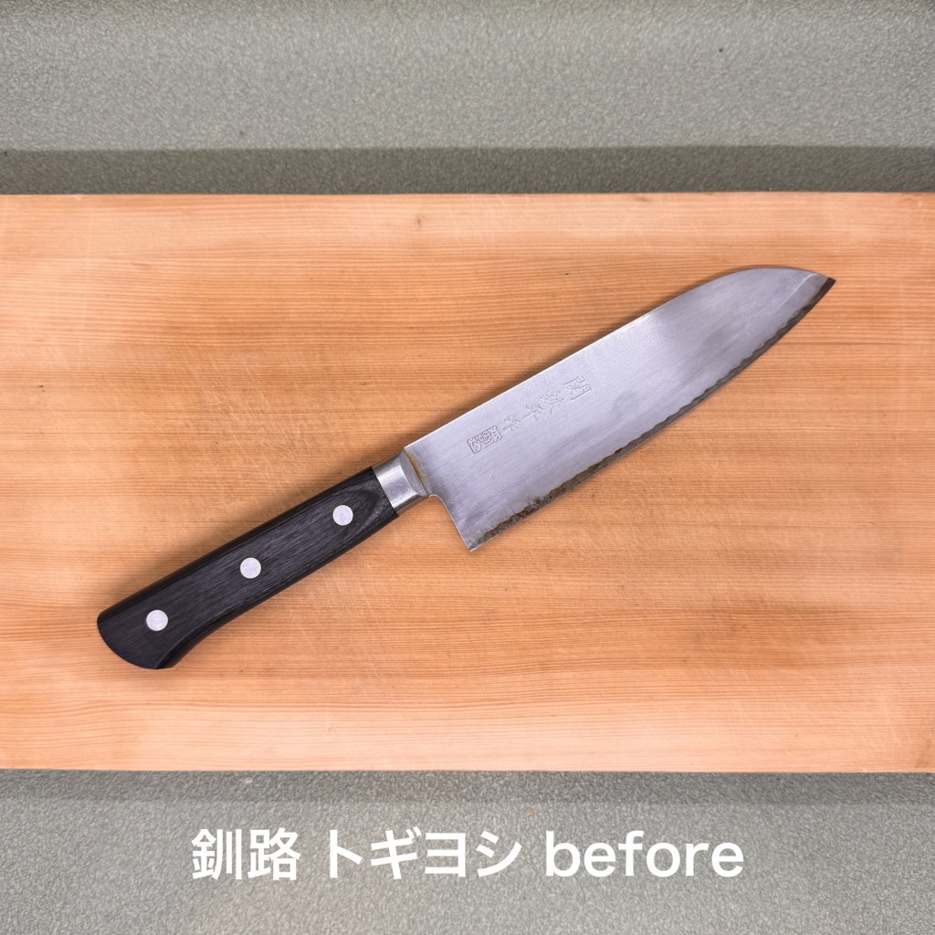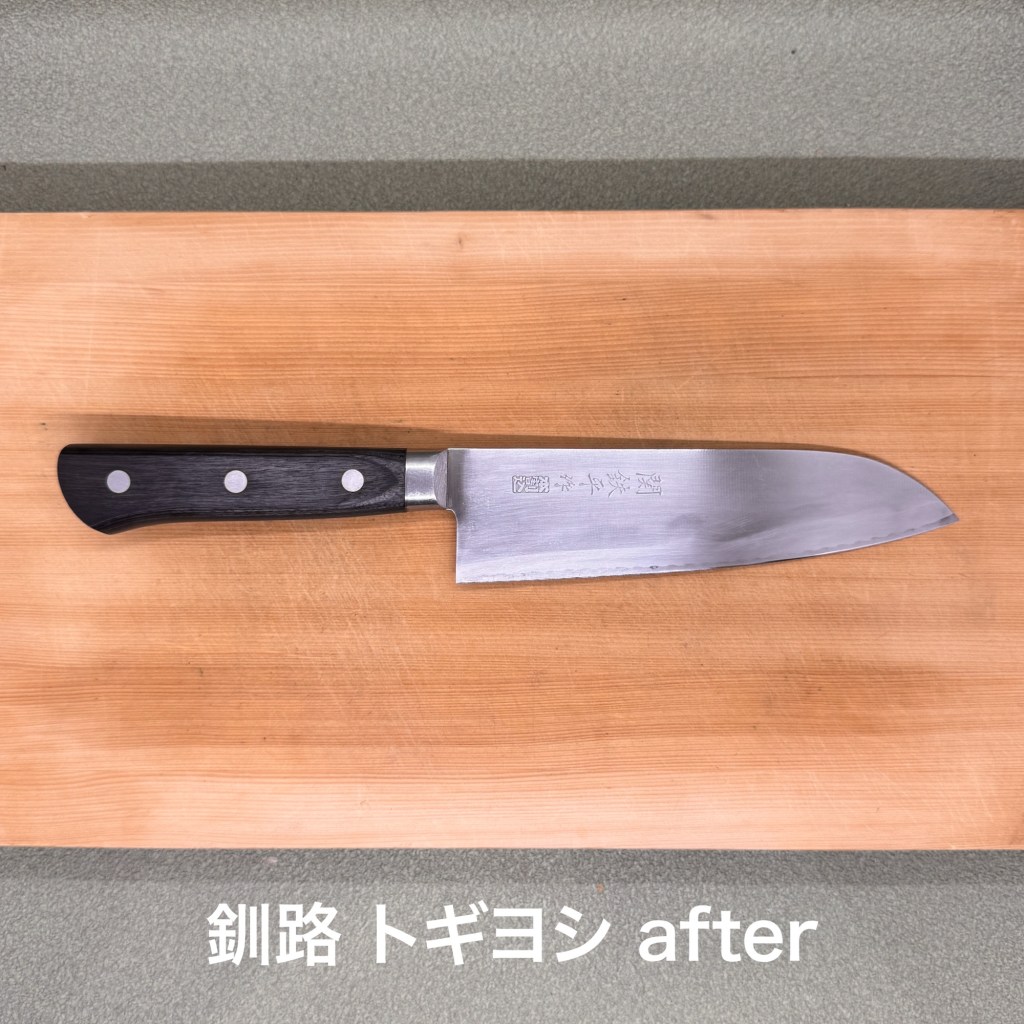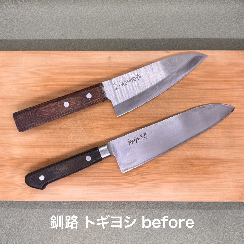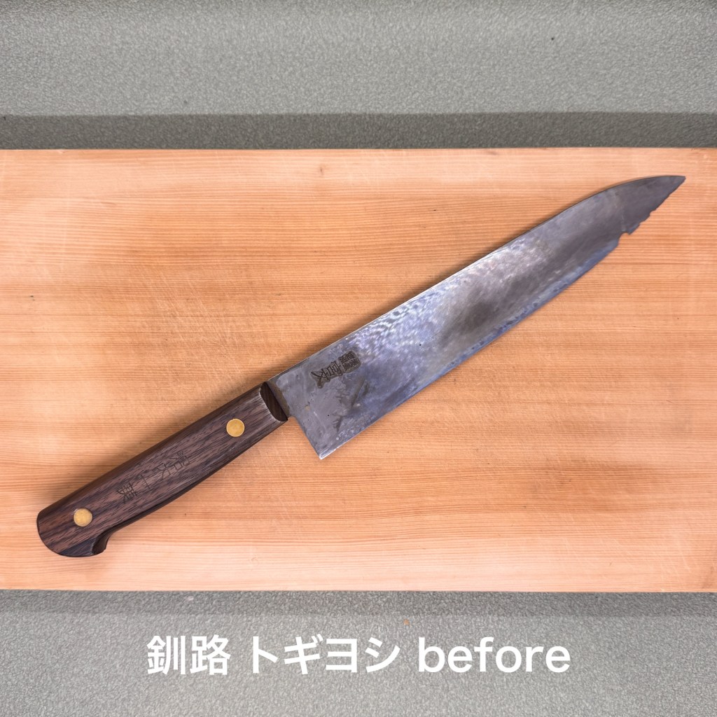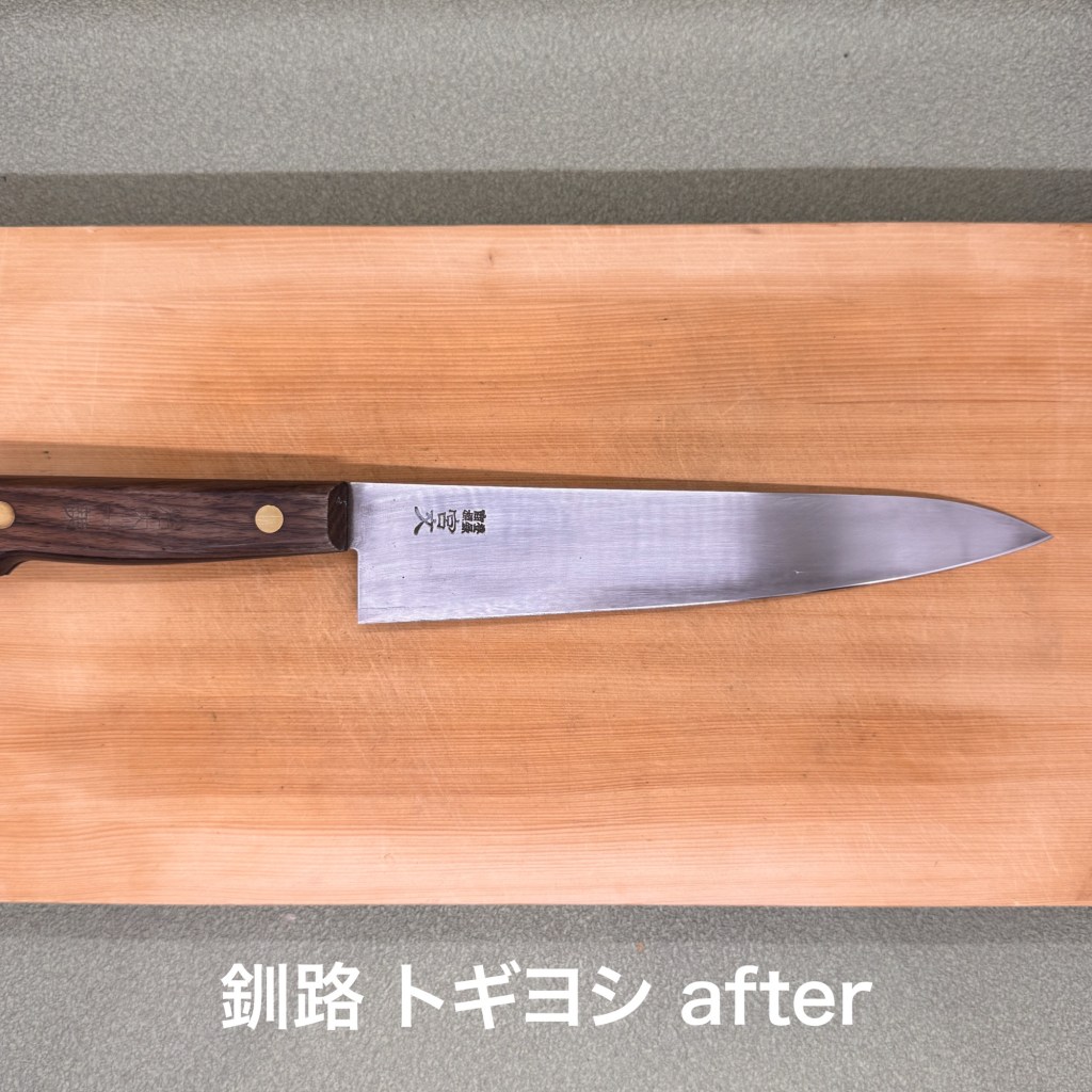有次と木屋ハイス鋼は硬くて研ぐのに一苦労でも仕上がりは最高なのが研ぎ師として嬉しい。堺菊虎の出刃は切刃を再構築したら荒砥の目が綺麗に出たので勿体無くてそのままにして小刃を付け直し仕上げています。関鉄平の三徳包丁は2回目の研ぎリピートありがとうございます。宮文の牛刀は大きく欠けていたのを修正。薄く研ぎ過ぎ刃先の厚さは0.2から0.3ミリくらいしかありませんでした。荒砥で欠けえお落としつつ刃線を整えて仕上げました。