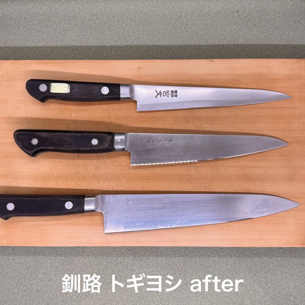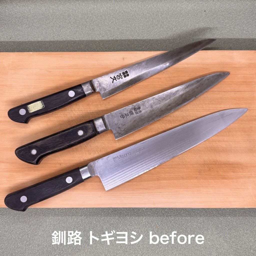 宮文のペティ、源正守の牛刀、ミソノの牛刀はお得意様の包丁。特に源正守の牛刀は柄の合わせ部が膨らんで、自分が埋めましたが、さらに開いていました。もう限界ですよとお伝えするのですが、使いやすくて中々手放せないとのこと。気持ちは重々わかります。ミソノの牛刀はお買い上げ頂いた牛刀もかなり使い込まれていましたが、キッチリ復活しましたよ。
