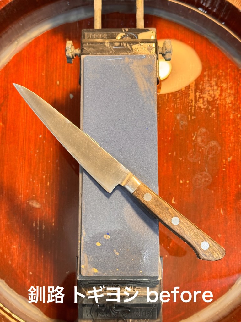 藤次郎のペティナイフ。汚れが気になっているとの事でCNSベベルで磨いてから刃を研ぎました。刃先はそれほど傷んではいないように見えたのですが、8000番で仕上げても納得がいかなかったのです12000で仕上げたら漸く仕上がりました。