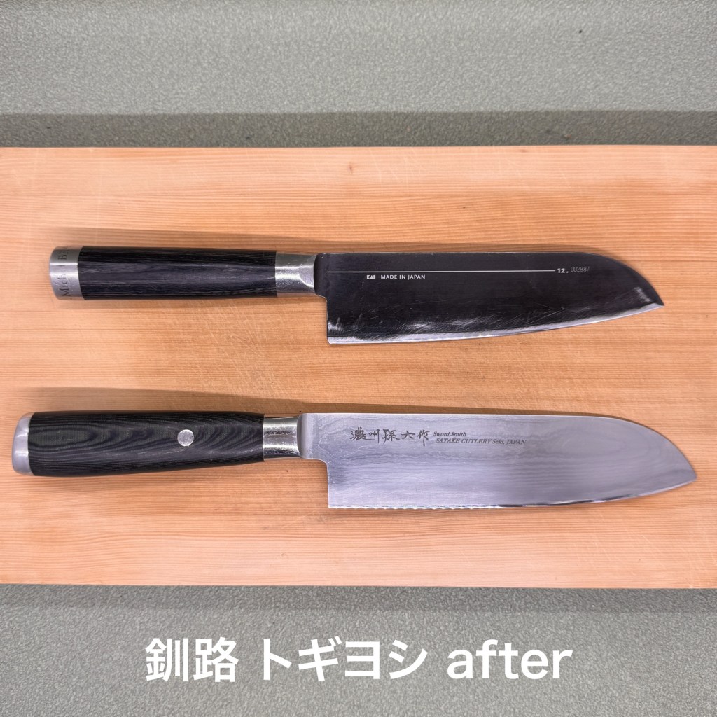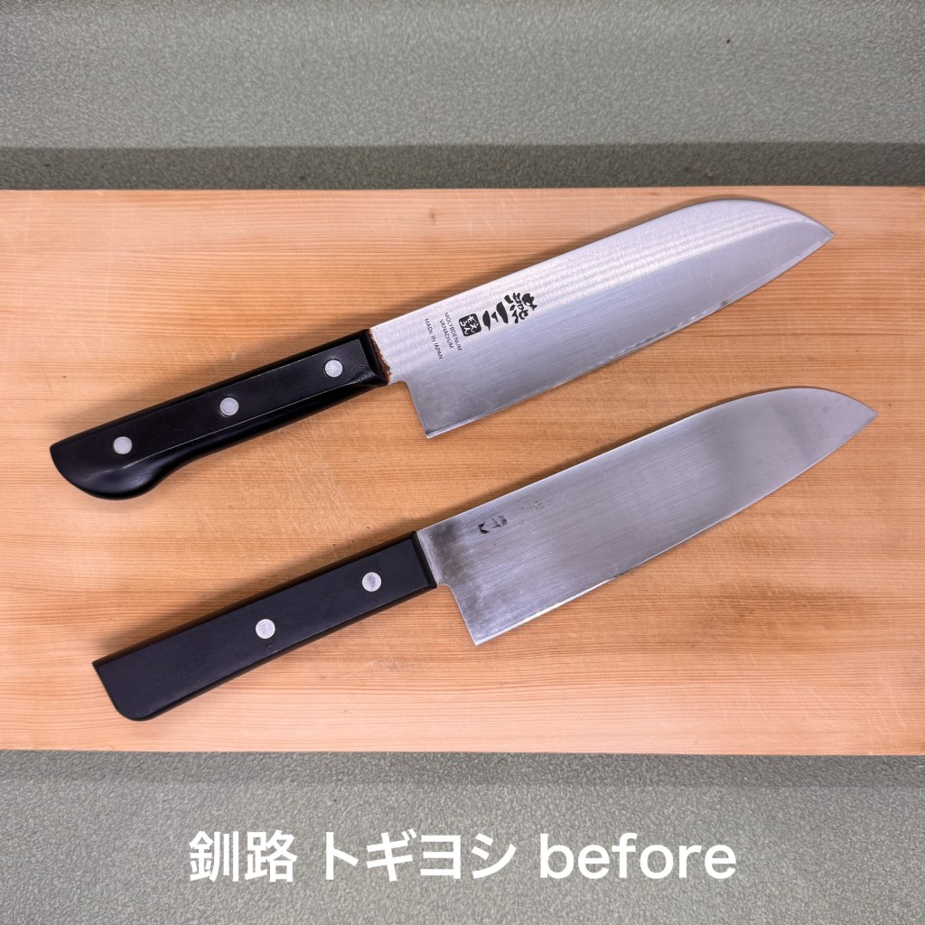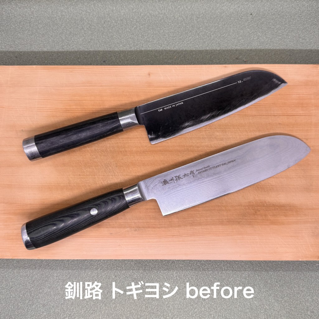 貝印のコーティング三徳包丁と濃州孫六の三徳包丁。特に濃州孫六のほうが刃線が手前が下がっているので修正しました。貝印の方はスムーズに研ぎ上がりました。