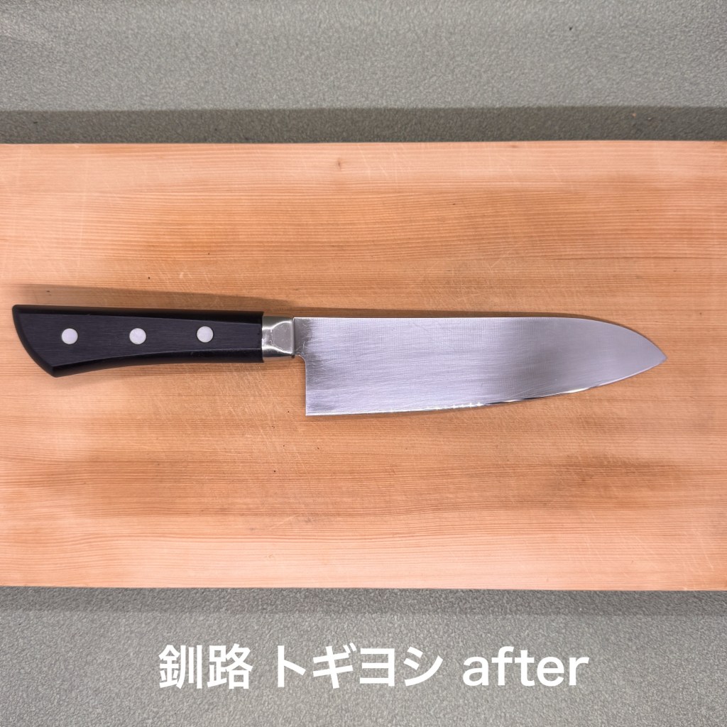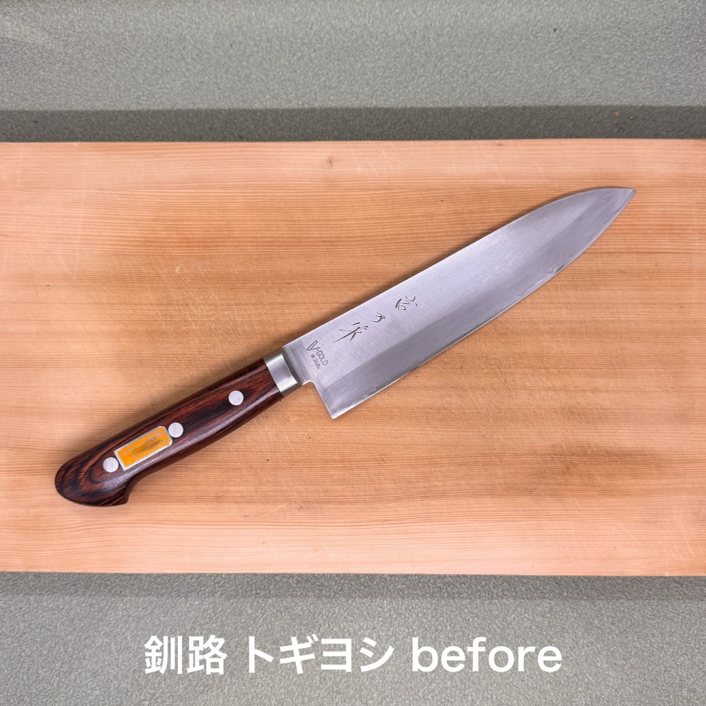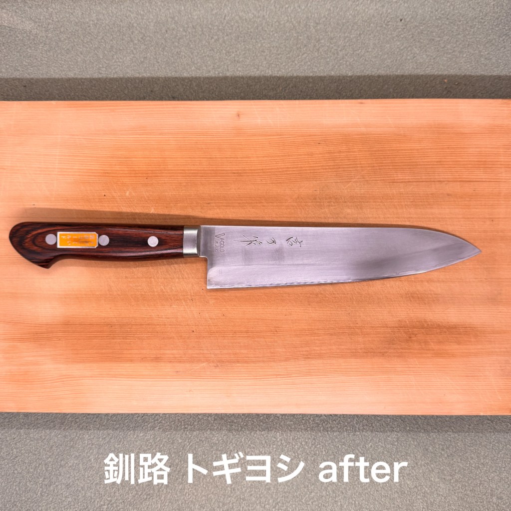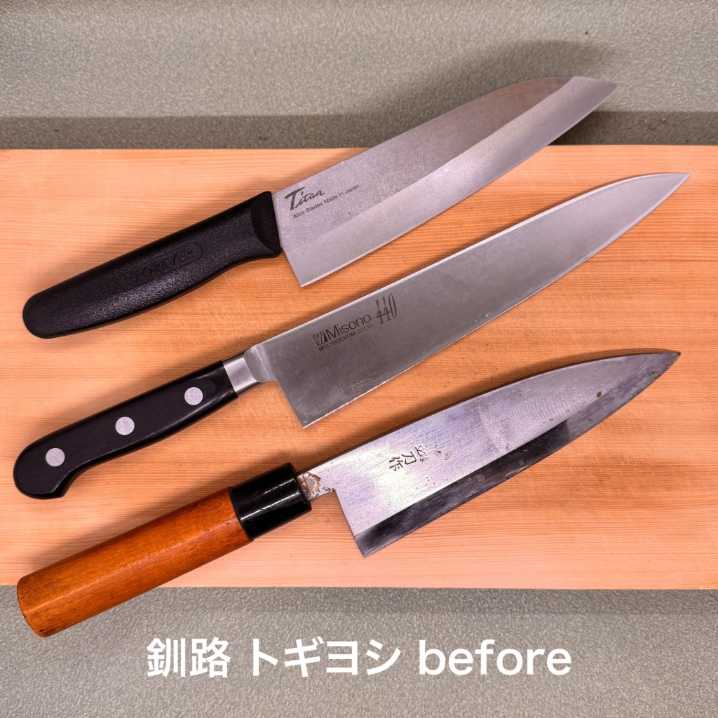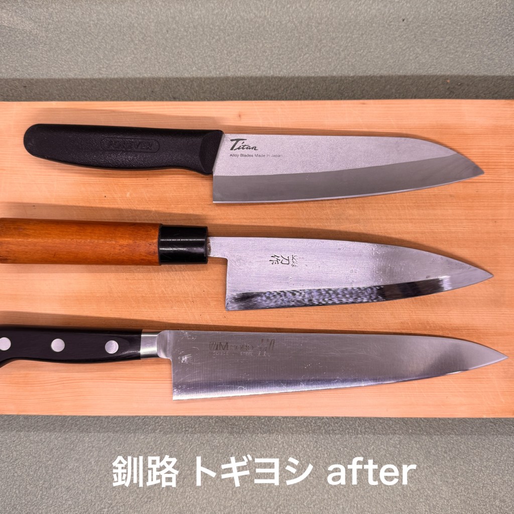 チタンの三徳包丁、刀作の出刃包丁、ミソノの牛刀はお得意様の包丁。リピートありがとうございます。どれも油汚れが残っていましたが、アルスの刃物クリーナーで綺麗に。刃先はの傷みは少なく、前にも研いでいるのでスムーズに研ぎ上がりました。