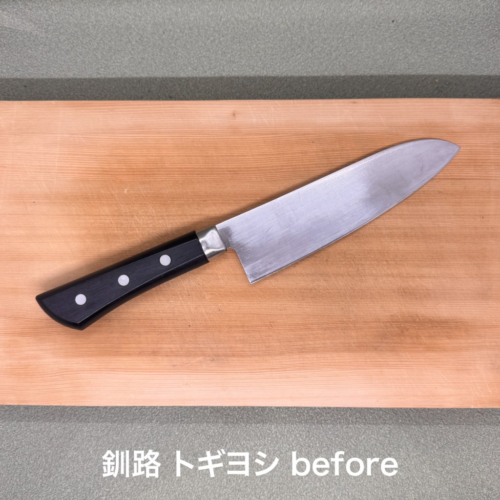 刻印が見えませんがKaiの三徳包丁。2回目の研ぎ。刃先は少し傷んでいましたが、こちらもスムーズに研ぎ上がりました。
