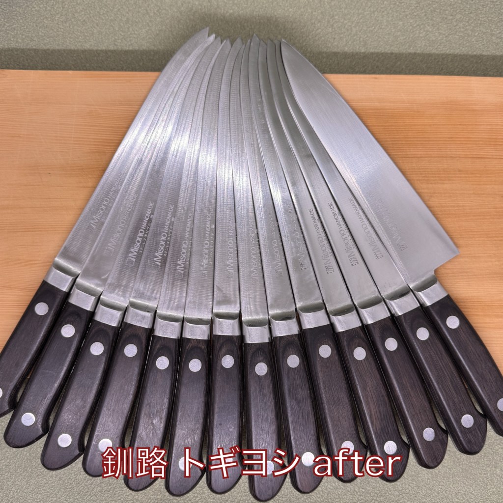 家庭科の実習用包丁研ぎのご依頼をいただきありがとうございます。私の形になっていないので、荒砥で形をつくるも前の研ぎ癖と長年の傷みでなかなかスムーズに進みませんでしたが、中砥でしっかり形を作って、仕上砥を当てたら綺麗に仕上がりました。