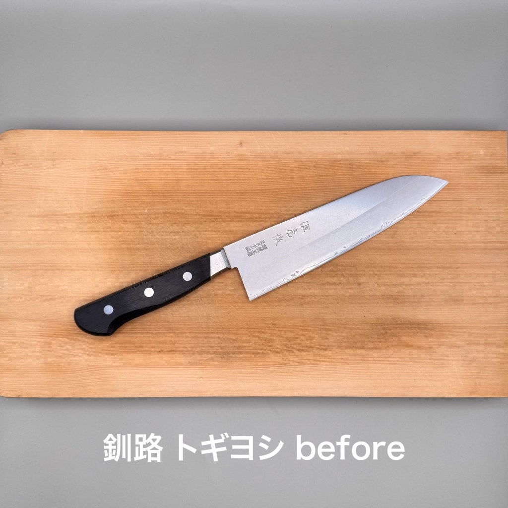 源虎徹の三徳包丁は当店で販売した包丁。芯金がスゥエーデン鋼でとてもよく切れます。刃先結構傷んでいたのですが、荒砥でカンタンに除去した後はスムーズに研ぎ上がりました。