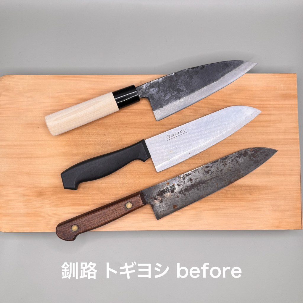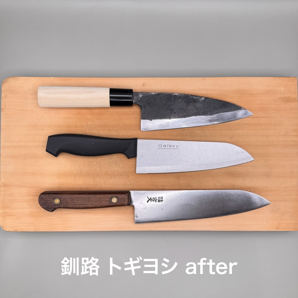 出刃包丁は珍しい両刃タイプ。新品n仕上げ研ぎのご依頼。切刃が研ぎ目が粗いので1から研ぎ直しました。綺麗になったでしょう!宮文のスウェーデン鋼の牛刀はすっかり黒ずんでしまっています。CNSベベルで徹底的に磨いたらここまで綺麗になりました。刃先はさすがスウェーデン鋼、切れ味バッチリに仕上がりました。GALAXYの三徳包丁は材質が柔らかくスムーズに仕上がりました。