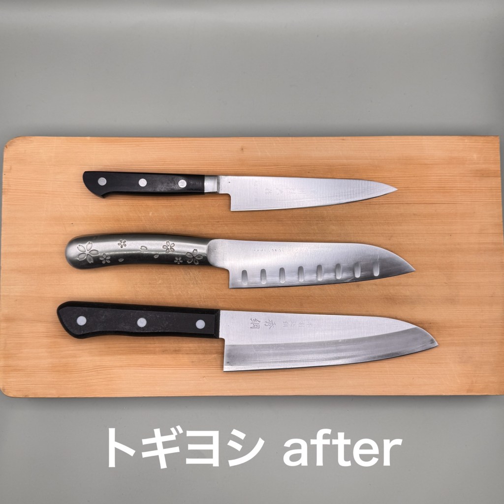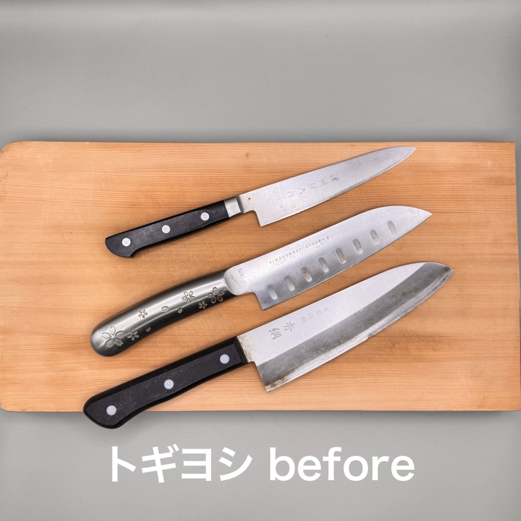 濃州孫六のペティ、関孫六の桜の三徳包丁、秀綱に三徳包丁は初めてのお客様。どの包丁も油汚れが残っていて、刃物クリーナーやインパクトクリーナーで何とか綺麗にしました。どの包丁も刃先が硬いものにあたって歪みがありますので歪みが無くなるところまで荒砥で落としてから仕上げました。これらの包丁では硬い物は切れませんので、ご注意ください。