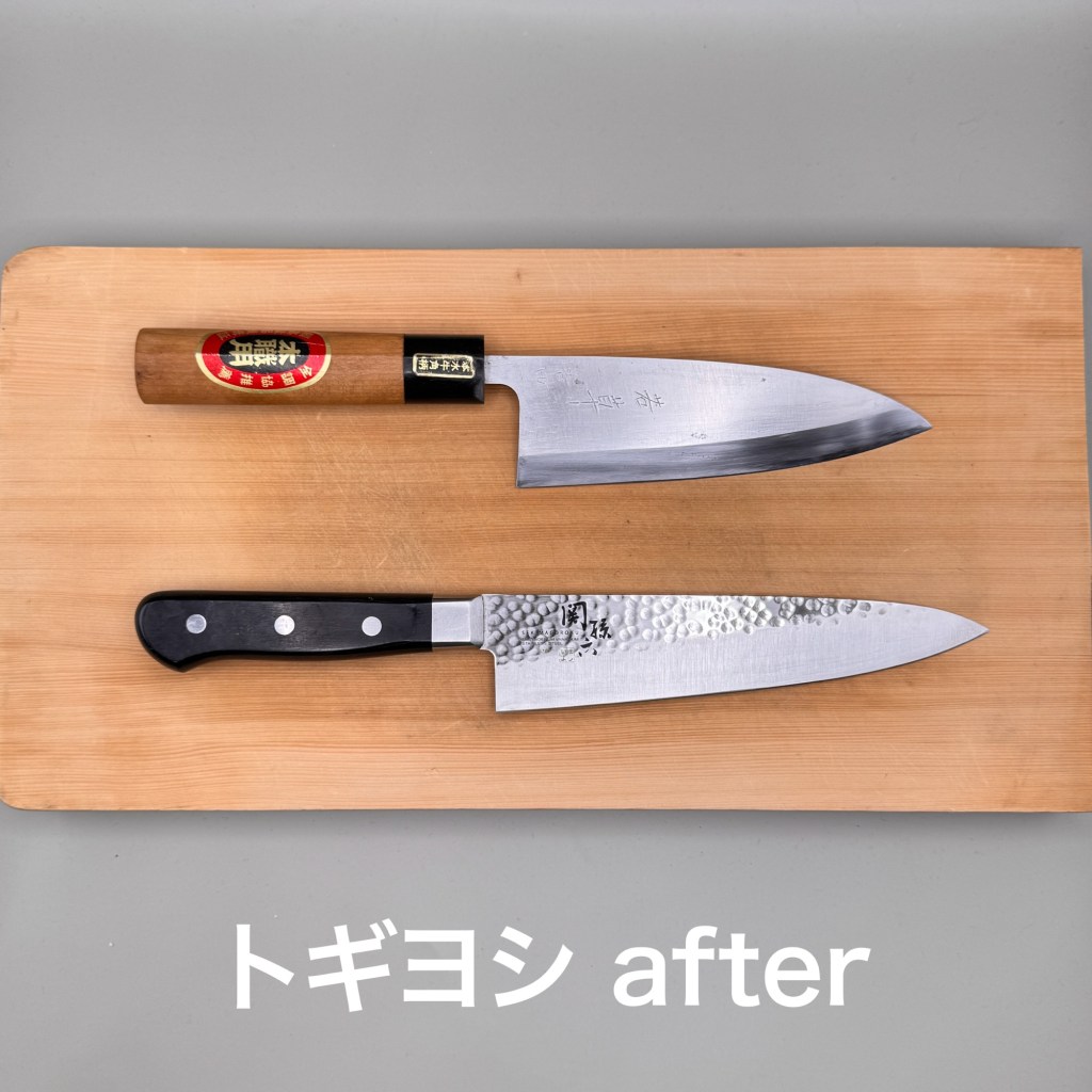 今日はリピートのお客様の包丁。ヘンケンルスのペティと関鉄平の三徳包丁。前にも研いで私の形になっているのでスムーズに研ぎ上がりました。若草の出刃包丁と関孫六の牛刀。出刃は何度か使ったら切れ味が落ちてという事で持ち込まれました。前の研ぎで小刃がほぼ無かったので、今回はしっかり小刃を付けて長持ちするようにしました。牛刀は少し油汚れが残っていたので刃物クリーナーで落とし、刃先はそこそこ傷んでいましたがスムーズに研ぎ上がりました。